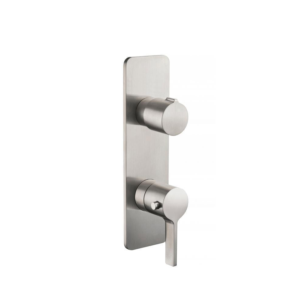 The 2720 series of products from Flusso use the TVH.2693 Thermostatic valve which features 3/4″ NPT connections and has one water output. The right handle sets the temperature. The left handle controls water volume.