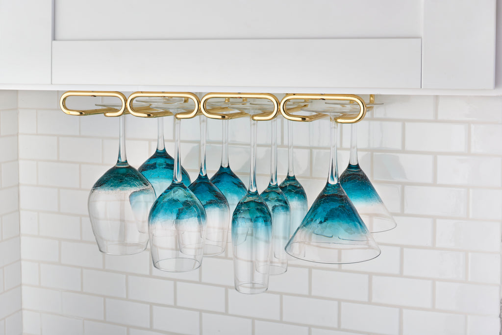Rev-A-Shelf® Quad-Stemware Holders are available in different finishes to organize your collection of stemware and match your kitchen/bar. Constructed of heavy gauge wire and feature a rear mounting plate for either face frame or frameless cabinet construction. All (4) organizers are attached together for a uniform look.. Included: (1) Brass quad stemware holder and mounting hardware