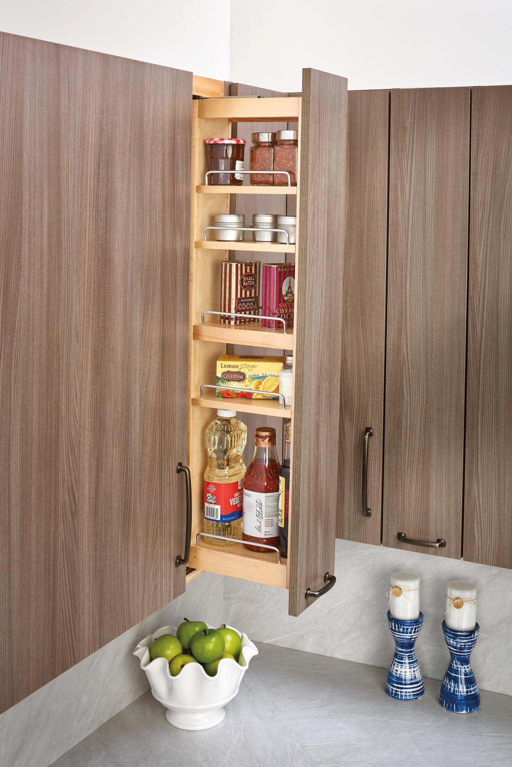 Building/remodeling your old kitchen? Well, all kitchens are not the same size and sometimes you are left with extra space that you hate to go wasted. Look no further and waste no more. Rev-A-Shelf® has created a filler that takes previously wasted and unusable space and creates a functional organizer. Fillers are intended to be installed in-between (2) cabinets in new kitchen construction/remodel job and will not work in existing kitchen cabinets. Fillers are available for your wall and base cabinets and also come in 3”, 6” and 9” widths and various heights (for wall cabinets). It is always good to consult with your kitchen designer to see if you have the space to add a filler.. Included: (1) Wood filler and (2) adjustable shelves with Chrome rails