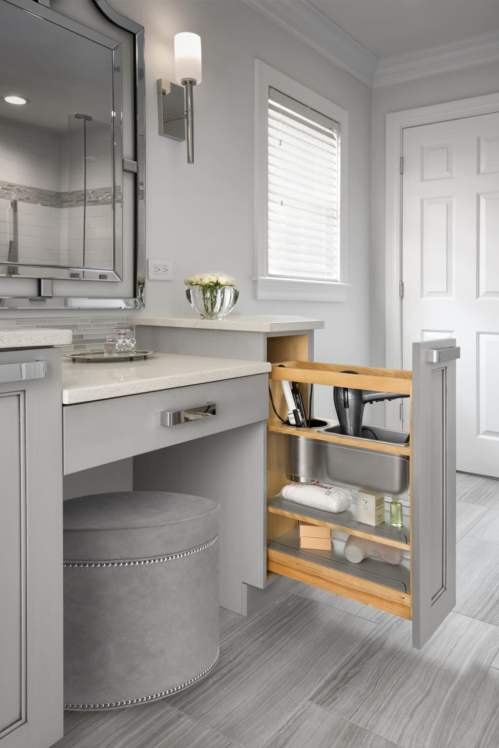 - Adjustable shelves and bins perfect for curling irons and hair dryers