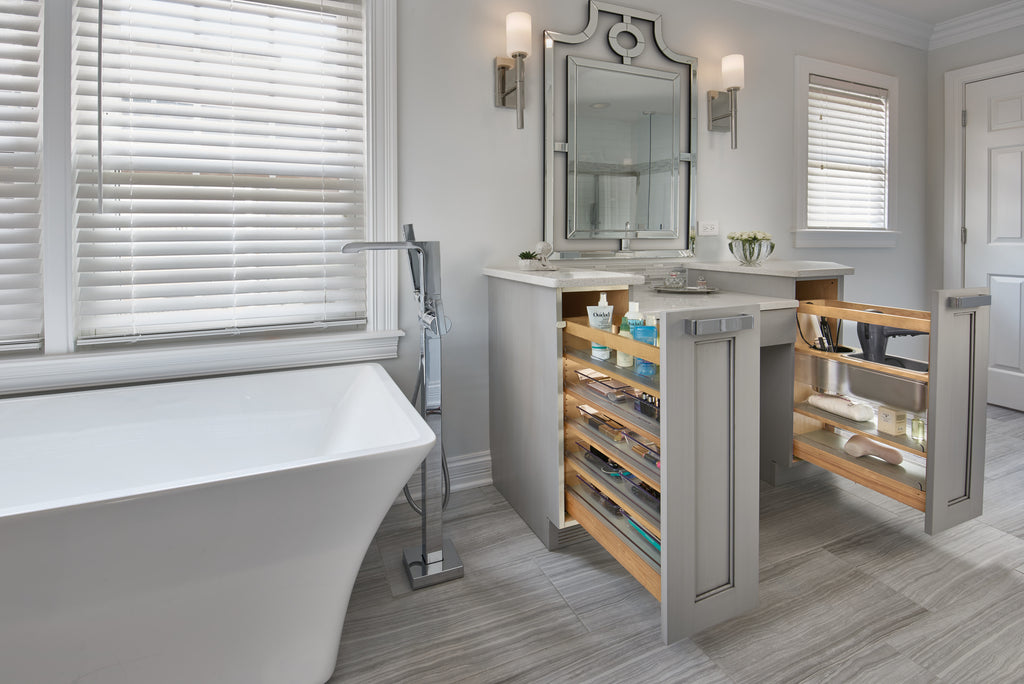 Rev-A-Shelf® Vanity Organizers are perfect height and depth for most bathroom vanities. Organize all of your bathroom necessities without having to reach in the back of your cabinets. Features our patented door mount brackets that allow up to 5" of flexibility to work with almost any door style. Glides out on BLUM tandem slides system. 20" vanity height and 25" counter height applications are available.. Included: (1) Wood Organizer with (2) Stainless-Steel bins and mounting hardware