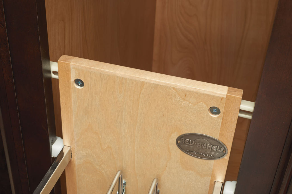 If you're tired of cluttered, unorganized, and hard-to-access cabinets, then look no further than the Rev-A-Shelf® Bakeware Organizer. This fully assembled bakeware organizer will bring your heavy platters and baking dishes right to your fingertips with its heavy-duty soft-close slides. Change it up and use one side for baking sheets and/or platters and the other side for large rolls of foil or stretch wrap. The unit works best in a full-height cabinet where no drawer is above, but will work with a door/drawer cabinet, but note that some taller items may not fit as well. Available in multiple widths and with the included door-mount brackets to attach to your existing cabinet door, this unit will surely make your kitchen tasks much easier.. Included: (1) Wood organizer, adjustable dividers, (1) slide, mounting hardware and door-mount brackets