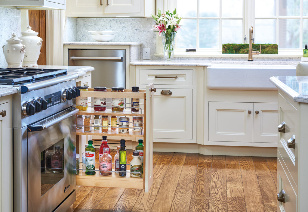 If you're tired of cluttered, unorganized and hard to access cabinets, then look no further than the Rev-A-Shelf® pullout shelving system. This innovative series of pull-out organizers are available in a variety of sizes (depth, height and width) and are available in a variety of style to accommodate any type of kitchen. From baking sheets, spices, cutting boards, utensils and even knife organization. No kitchen is complete without one of these organizers and it will change how you use your kitchen. All units require a full-height cabinet (where no drawer is above) and cabinet door must attach to gain the full features of the unit.. Included: (1) Wood organizer, adjustable shelves with Chrome rails and mounting hardware