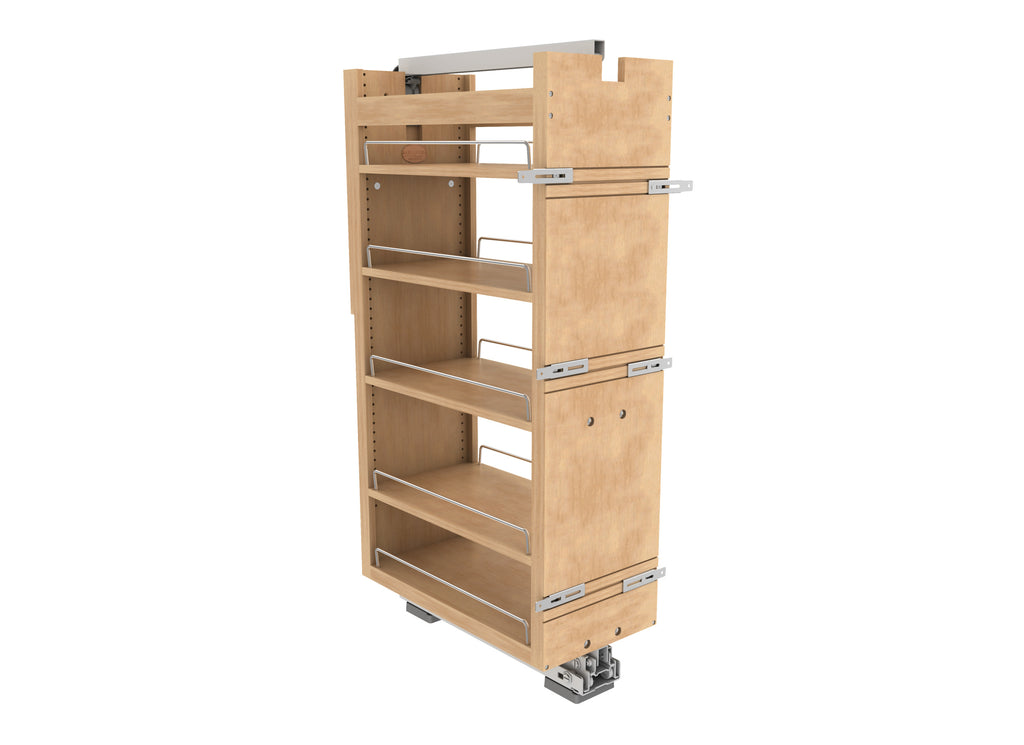 Maximize your storage space with this fabulous and functional Pullout Pantry. Riding on a Fulterer EZ close slide system with a top-guide rail, it has stability that is second to none. The natural maple frame and adjustable shelves are complemented by chrome rail accents and provide customization to accommodate your unique storage needs.. Included: (1) Wood organizer frame, (1) heavy-duty slide, (2) adjustable shelves with chrome rails, (3) static shelves with chrome rails, mounting hardware and door-mounting brackets
