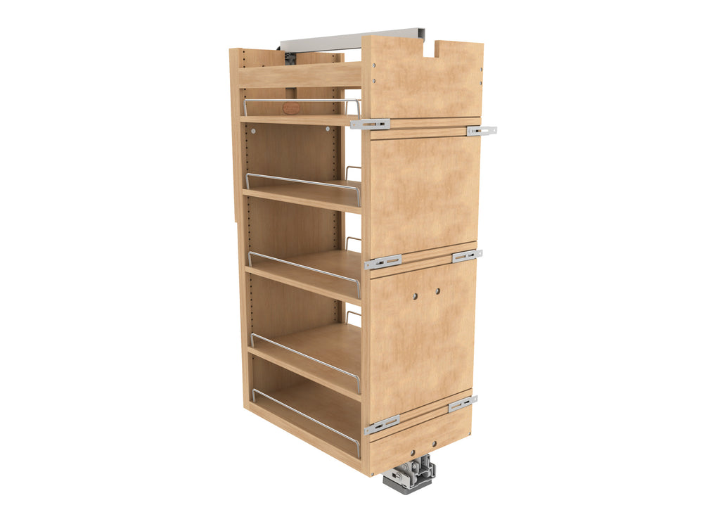Maximize your storage space with this fabulous and functional Pullout Pantry. Riding on a Fulterer EZ close slide system with a top-guide rail, it has stability that is second to none. The natural maple frame and adjustable shelves are complemented by chrome rail accents and provide customization to accommodate your unique storage needs.. Included: (1) Wood organizer frame, (1) heavy-duty slide, (2) adjustable shelves with chrome rails, (3) static shelves with chrome rails, mounting hardware and door-mounting brackets