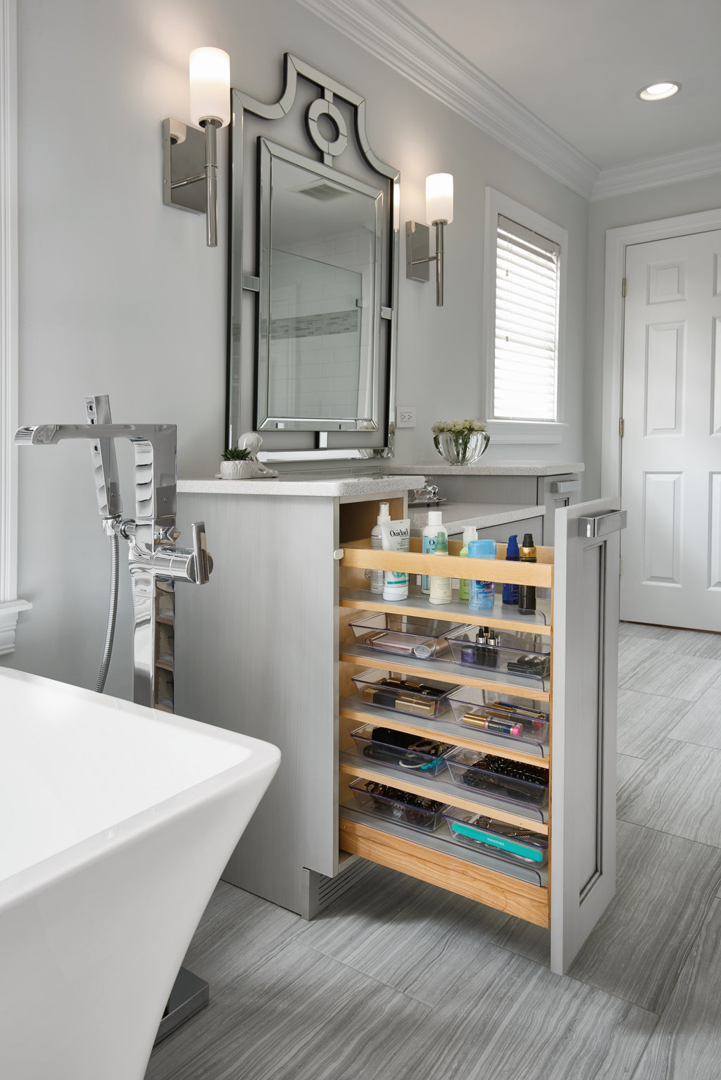 Rev-A-Shelf® Vanity Organizers are perfect height and depth for most bathroom vanities. Organize all of your bathroom necessities without having to reach in the back of your cabinets. Simple installation and patented door mount kit is included to attach your own cabinet door to the front of the unit for easy one-step access. The 448-VC is available in both a vanity Height and base height version, and features our patented adjustable door mount brackets that allow up to 5" of flexibility for trouble-free installation on any door style.. Included: (1) Wood organizer, (3) adjustable shelves with Polycarbonate rails, (6) Polycarbonate bins and mounting hardware