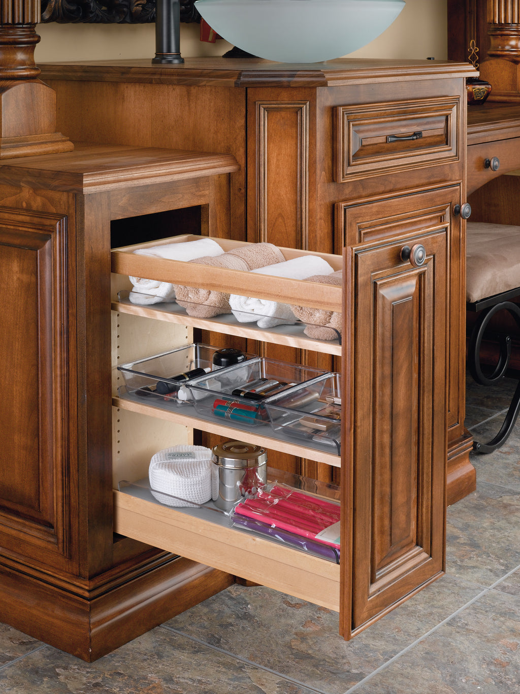 - Wood organizer simply fits into existing cabinet