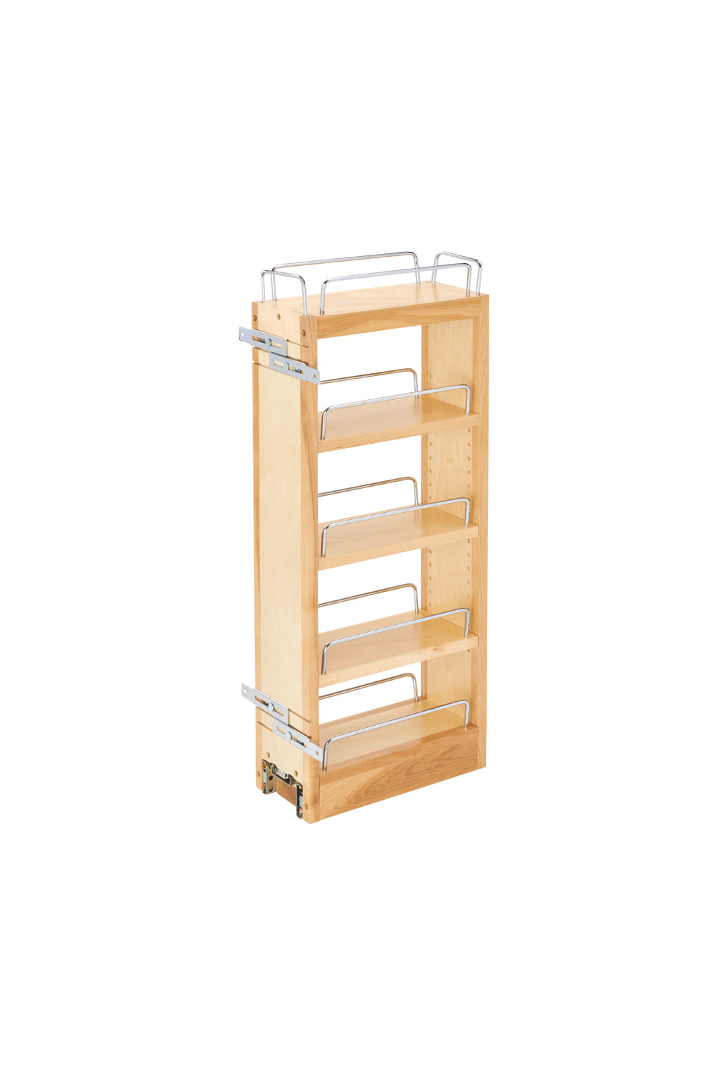 Do you need that one item in the back of your wall cabinet, and the only way to access it is to pull everything out? Stop the madness with the Rev-A-Shelf® pullout shelving system, whose open design ensures you can effortlessly find everything. Available in varying heights and sizes, they door-mount giving you a uniquely customized look and easy operation.. Included: (1) Wood organizer, (3) adjustable shelves with Chrome rails and mounting hardware