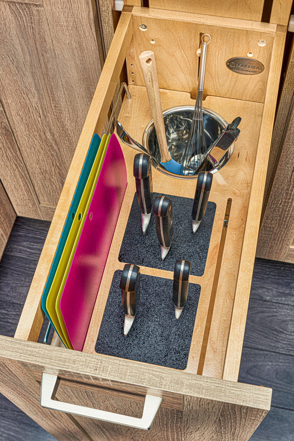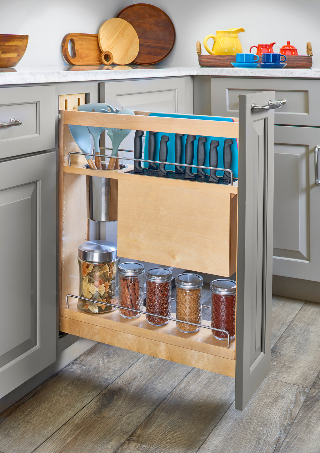 If you're tired of cluttered, unorganized and hard to access cabinets, then look no further than the Rev-A-Shelf® pullout shelving system. This innovative series of pull-out organizers are available in a variety of sizes (depth, height and width) and are available in a variety of style to accommodate any type of kitchen. From baking sheets, spices, cutting boards, utensils and even knife organization. No kitchen is complete without one of these organizers and it will change how you use your kitchen. All units require a full-height cabinet (where no drawer is above) and cabinet door must attach to gain the full features of the unit.. Included: (1) Wood knife block organizer, (4) flexible plastic cutting mats (11" W x 15" D x .03" H), (1) stainless-steel bin, (1) Set of adjustable rub bushings, chrome rails and mounting hardware