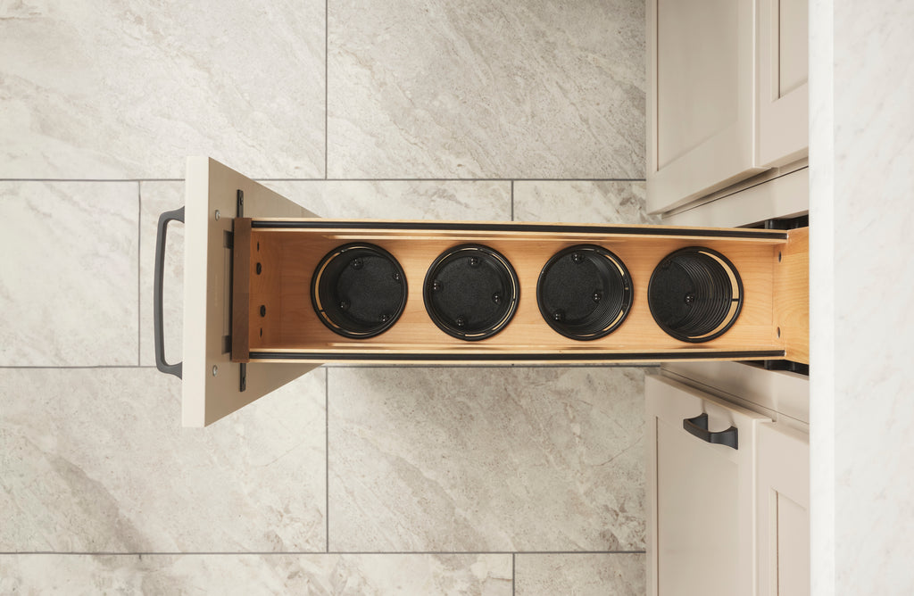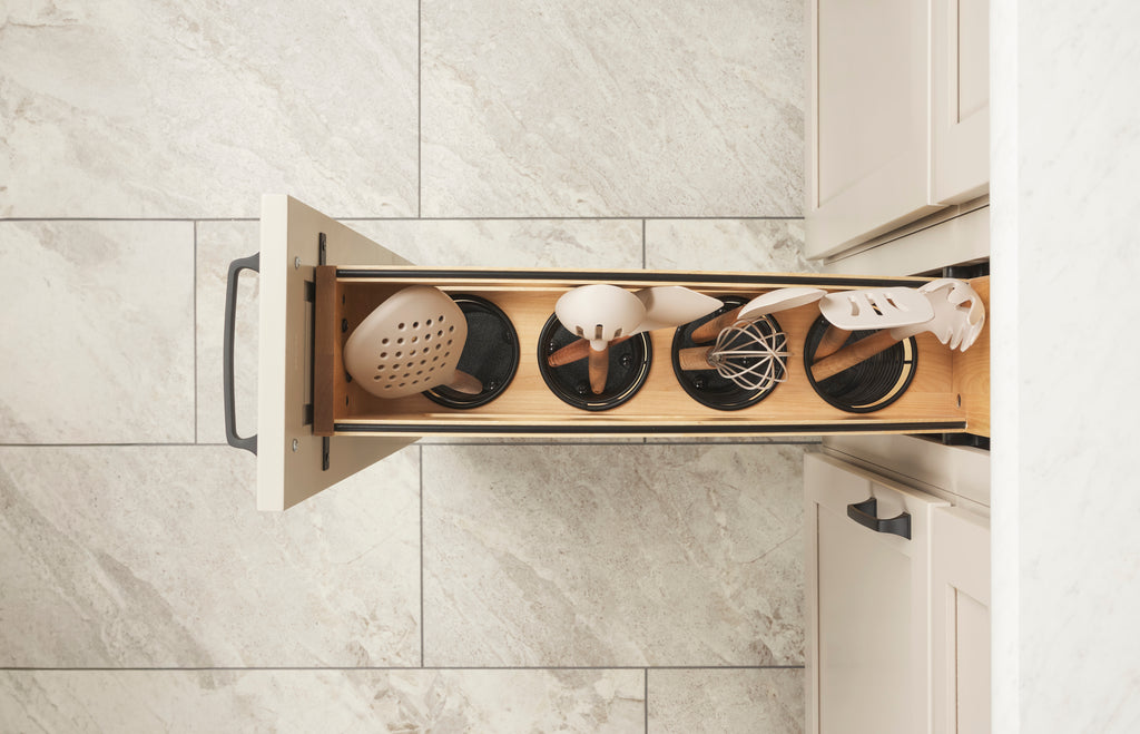 Available in two sizes, it includes a fixed upper shelf with up to four removable wire bins, a fixed lower shelf, and BLUM soft-close slides for smooth functionality.. Included: (1) Wood organizer frame, (1) pair of soft-close slides, (2) fixed shelves, (4) 1 qt. removable wire utensil bins and mounting hardware