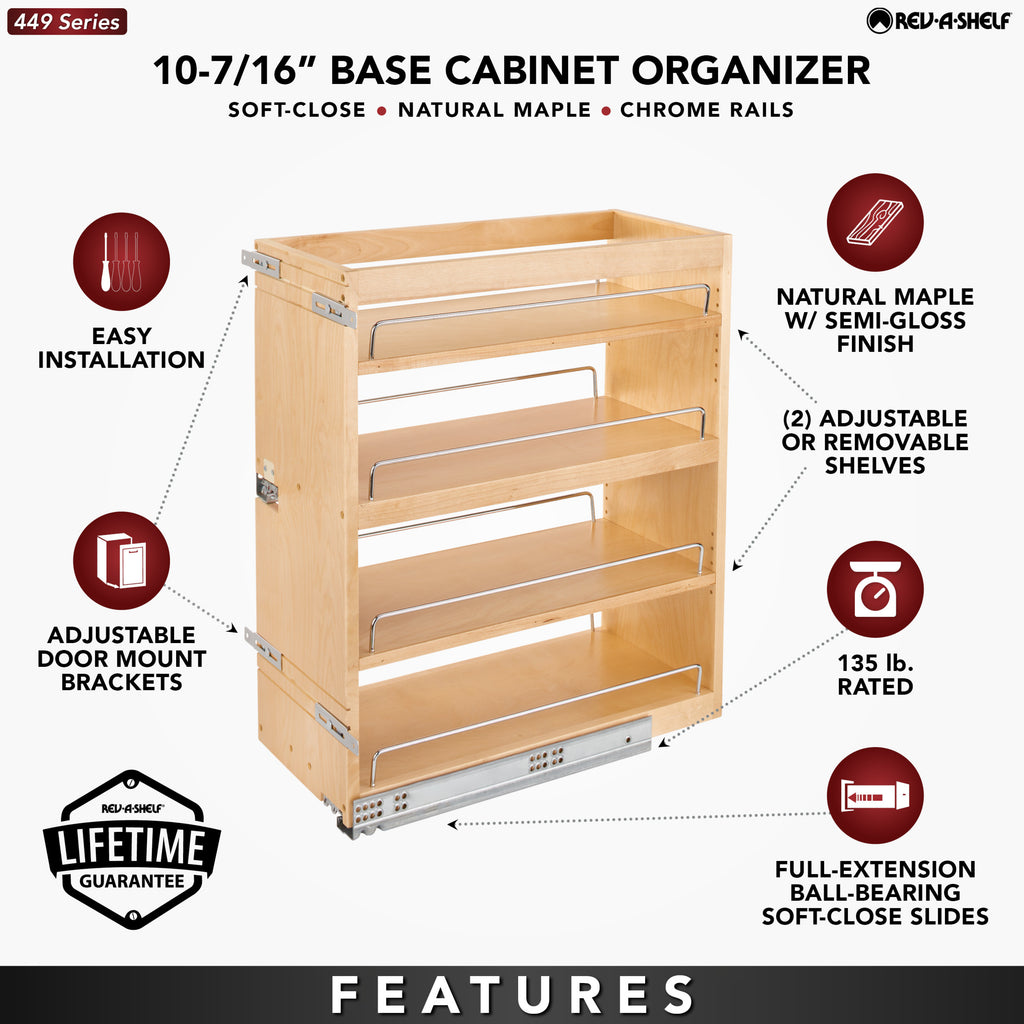 If you're tired of cluttered, unorganized and hard to access cabinets, then look no further than the Rev-A-Shelf® pullout shelving system. This innovative series of pull-out organizers are available in a variety of sizes (depth, height and width) and are available in a variety of style to accommodate any type of kitchen. From baking sheets, spices, cutting boards, utensils and even knife organization. No kitchen is complete without one of these organizers and it will change how you use your kitchen. All units require a full-height cabinet (where no drawer is above) and cabinet door must attach to gain the full features of the unit.. Included: (1) Wood organizer, adjustable shelves with Chrome rails and mounting hardware