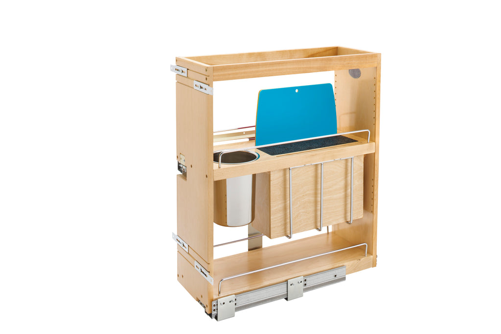 If you're tired of cluttered, unorganized and hard to access cabinets, then look no further than the Rev-A-Shelf® pullout shelving system. This innovative series of pull-out organizers are available in a variety of sizes (depth, height and width) and are available in a variety of style to accommodate any type of kitchen. From baking sheets, spices, cutting boards, utensils and even knife organization. No kitchen is complete without one of these organizers and it will change how you use your kitchen. All units require a full-height cabinet (where no drawer is above) and cabinet door must attach to gain the full features of the unit.. Included: (1) Wood knife block organizer, (4) flexible plastic cutting mats, (1) stainless-steel bin, (1) Set of adjustable rub bushings, chrome rails and mounting hardware