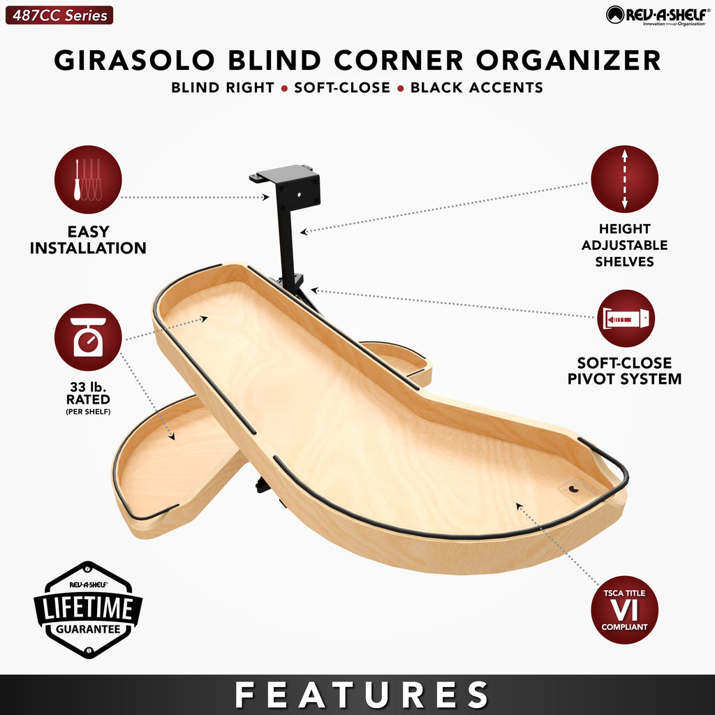 The 487CC Series Craftsman Collection "Girasolo" Blind Corner Optimizer by Rev-A-Shelf® offers a refined and sophisticated update to the classic Girasolo design. Crafted from maple with gracefully curved lines and soft edges, this innovative solution blends both elegance and practicality.