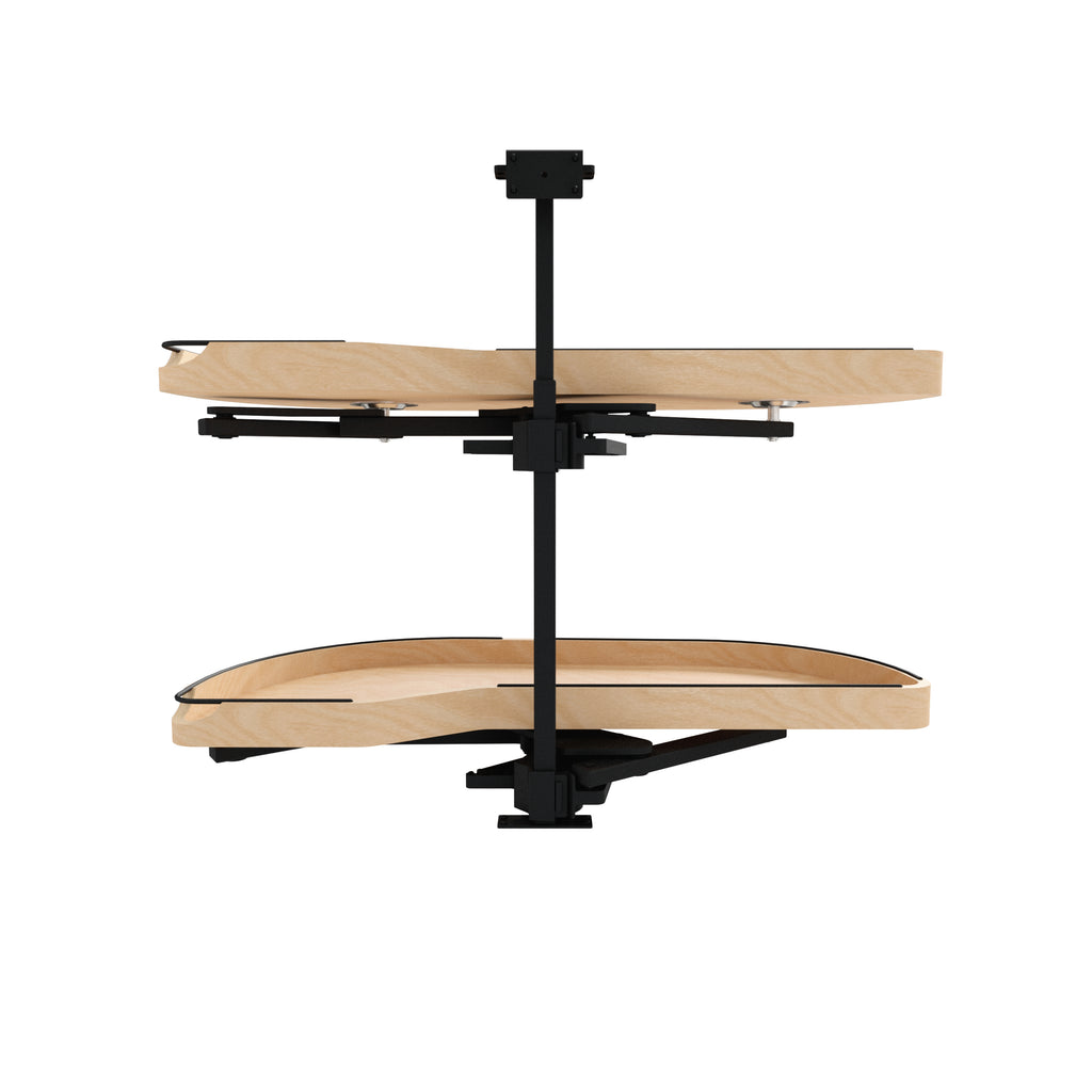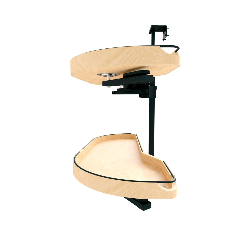 The Girasolo glides effortlessly out of the cabinet on a soft-close pivot hardware system, eliminating the need for adjacent appliance clearance and maximizing accessibility. Designed for both right and left blind corner cabinet openings, it is available in multiple sizes and single or two-tier configurations, providing versatile storage options for hard-to-reach spaces.. Included: (2) Wood left Girasolo trays w/ black wire accents, post mechanism, soft-close pivot hardware system and mounting hardware