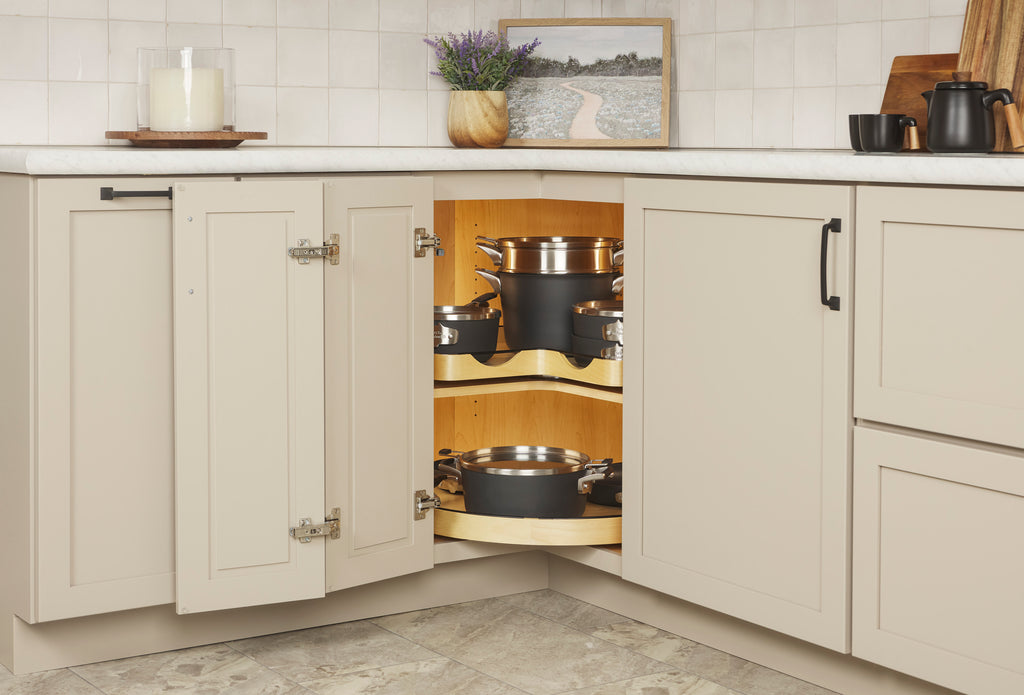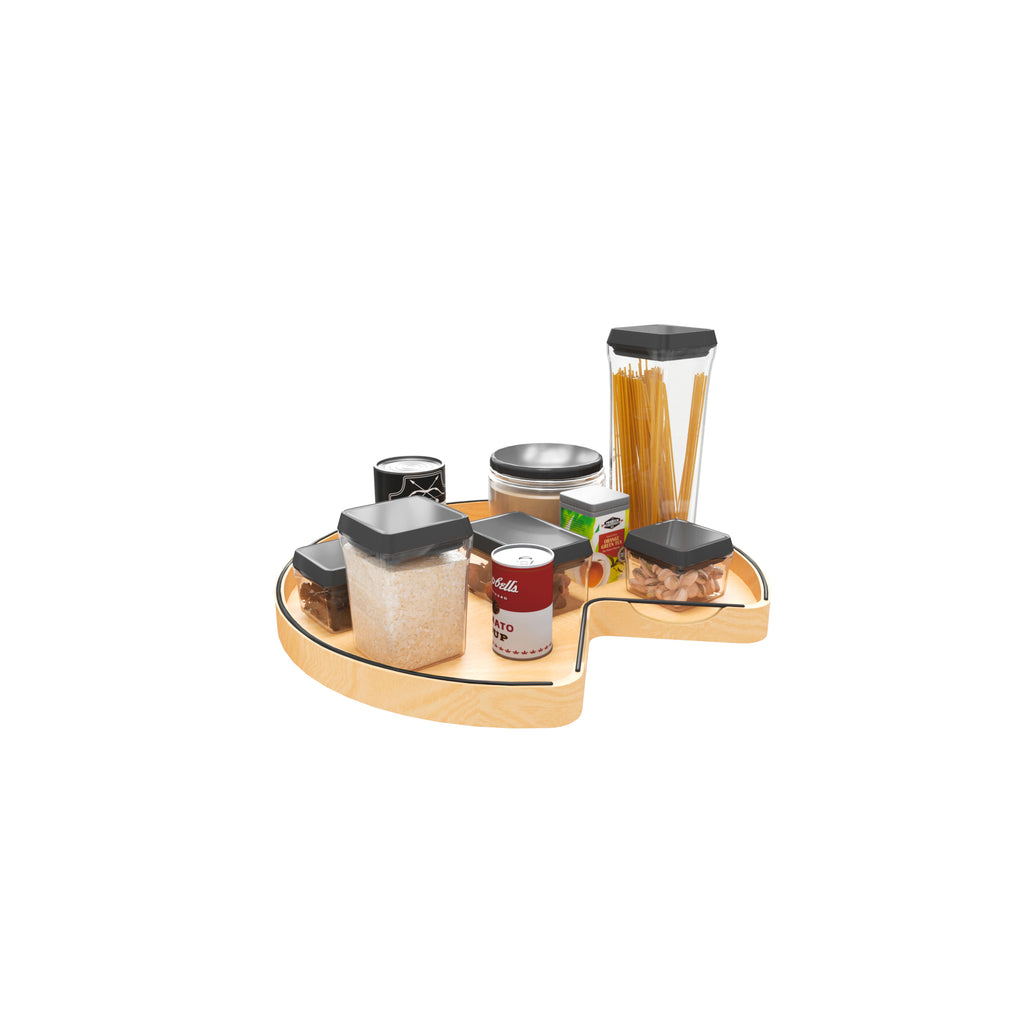Put a new “spin” on your corner cabinet organization with the 4CC-401 Series Craftsman Collection Kidney-Shaped Lazy Susan. Features gorgeous natural maple construction and a unique scoop-out design in the front that allows the recessed black wire accents to double as a handle for easy operation.. Included: (1) Wood Kidney-Shaped Shelf with a 7" steel bearing and mounting hardware
