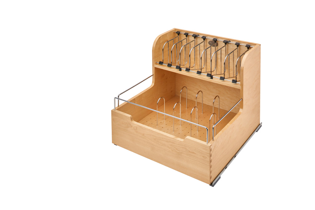 Rev-A-Shelf® can help restore some sanity with this unique storage idea. Plastic storage containers come in so many shapes and sizes and it is hard to keep up with all of them. Organize your containers and lids separately in their own compartments to always know that you have a matching set. You will actually want your family to return all of your plastic storage after they borrow it.. Included: (1) Wood Organizer, (8) Dividers, and (1) set of BLUM slides