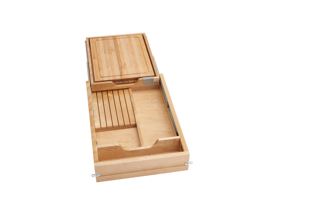 If you want a professional kitchen with a prep station, then look no further than the Rev-A-Shelf® combination knife holder and cutting board. The unique design has additional compartments for storing cutlery, utensils and more. Available in varying sizes for multiple cabinet applications, this complete drawer has you covered from preparation to serving. Drawer slides are not included and are sold separately.. Included: (1) Wood drawer, (1) Wood Cutting board