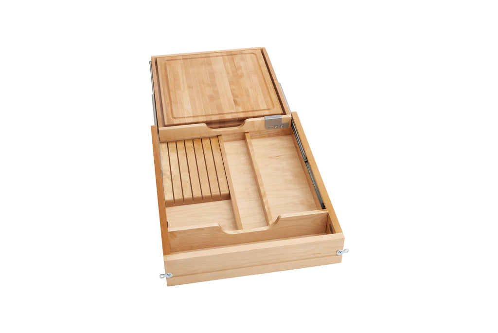 If you want a professional kitchen with a prep station, then look no further than the Rev-A-Shelf® combination knife holder and cutting board. The unique design has additional compartments for storing cutlery, utensils and more. Available in varying sizes for multiple cabinet applications, this complete drawer has you covered from preparation to serving. Drawer slides are not included and are sold separately.. Included: (1) Wood drawer, (1) pair of Blum slides, (1) Wood Cutting board