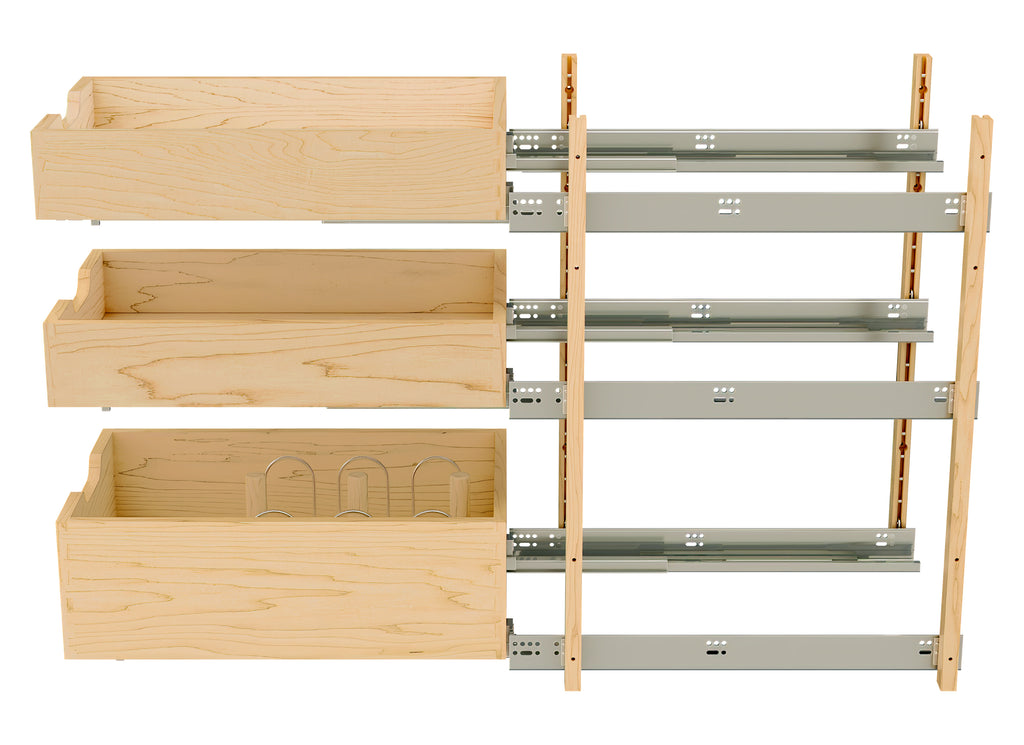 For those seeking a tailored and efficient storage solution, the 4PIL Wood Pilaster is the ultimate choice. This revolutionary system is the epitome of adaptability for kitchen and pantry organization. This system is designed for door/drawer and full -height base cabinets, providing versatile storage solutions with double and triple-drawer options. The stackable design caters to pantry applications, maintaining a sleek aesthetic with no visible holes. Installation and adjustability are easy.. Included: (4) 27.2" x 1.13" Pilaster uprights, (3) pilaster brackets, (1) 7" wood drawer box, (2) 4" wood drawer boxes, (6) wood pegs, (3) wire dividers, (3) BLUM soft-close slides and mounting hardware, (1) wood mounting template
