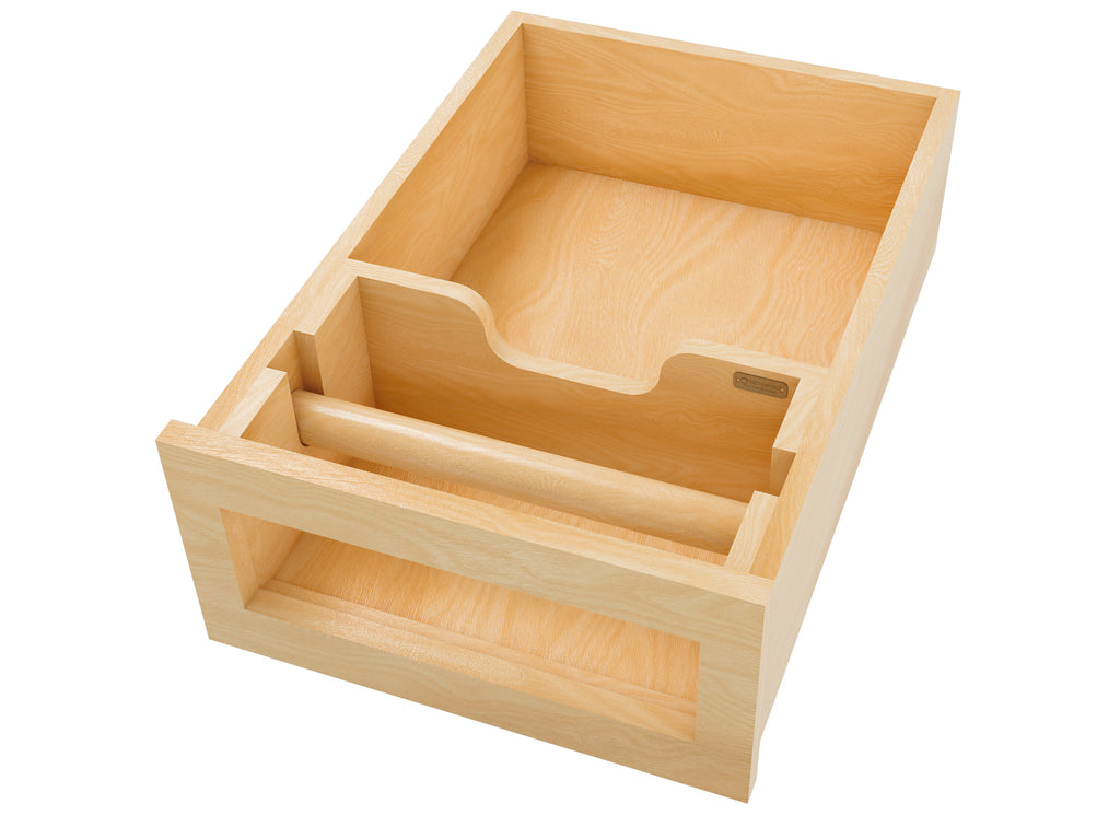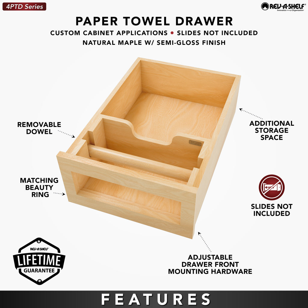 Reduce clutter on your countertops while still enjoying easy access to your paper towels with the 4PTD Series! This innovative drawer system offers ample storage space and a removable dowel for easy refilling.. Included: (1) Wood drawer system, (1) inset beauty ring, (1) removable dowel and adjustable mounting hardware