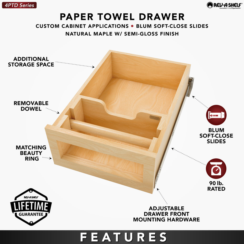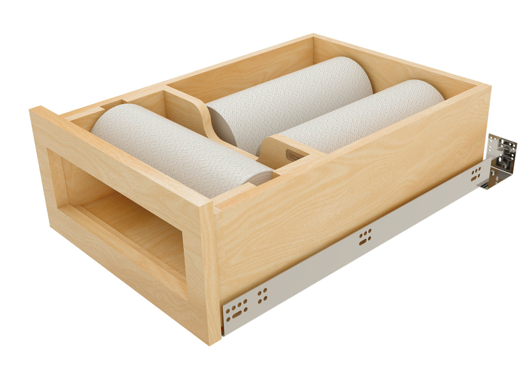 Reduce clutter on your countertops while still enjoying easy access to your paper towels with the 4PTD Series! This innovative drawer system offers ample storage space and a removable dowel for easy refilling.. Included: (1) Wood drawer system, (1) pair of soft-close slides, (1) inset beauty ring, (1) removable dowel and adjustable mounting hardware