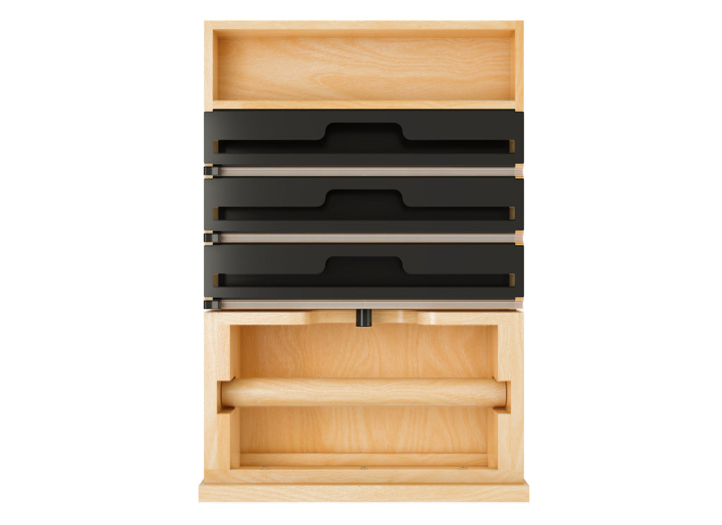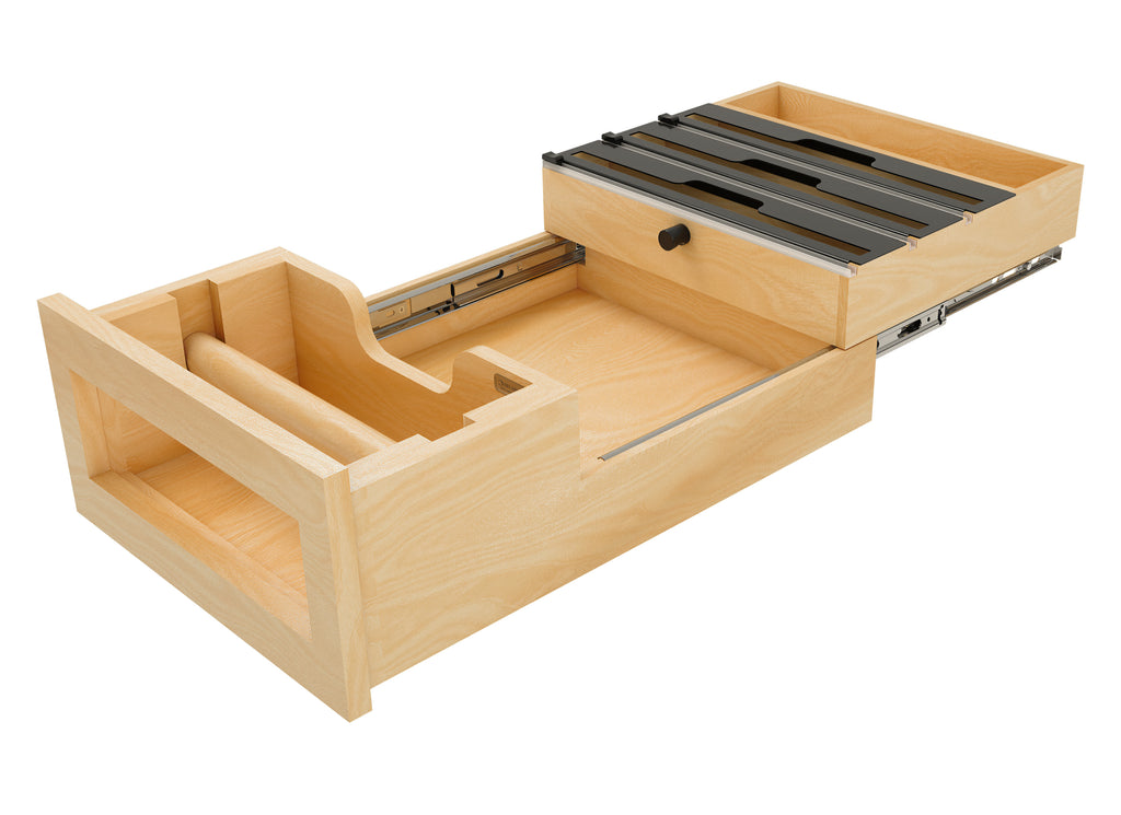 The design also includes three integrated holders with cutting blades, perfect for aluminum foil, plastic wrap, and parchment paper, making meal prep and cleanup effortless.. Included: (1) Wood drawer system, (3) holders with integrated cutting blades, (1) inset beauty ring, (1) removable dowel and adjustable mounting hardware