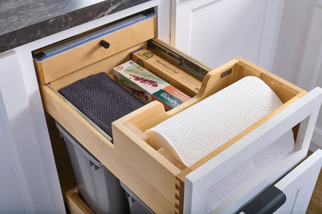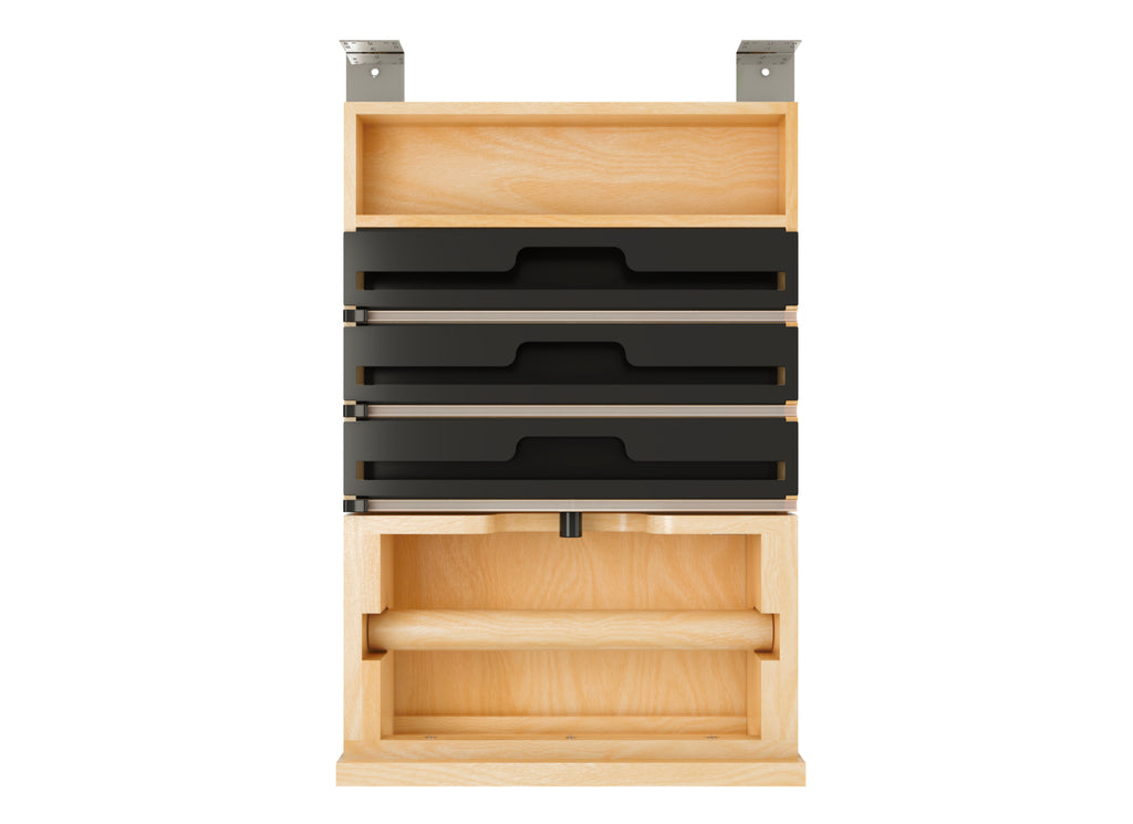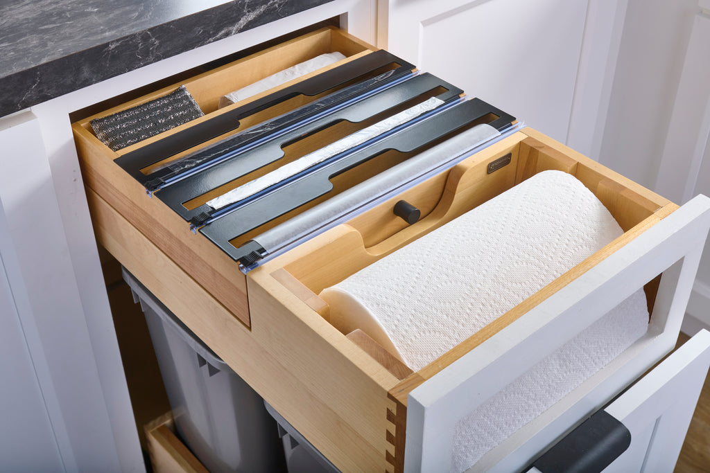The design also includes three integrated holders with cutting blades, perfect for aluminum foil, plastic wrap, and parchment paper, making meal prep and cleanup effortless.. Included: (1) Wood drawer system, (1) pair of soft-close slides, (3) holders with integrated cutting blades, (1) inset beauty ring, (1) removable dowel and adjustable mounting hardware