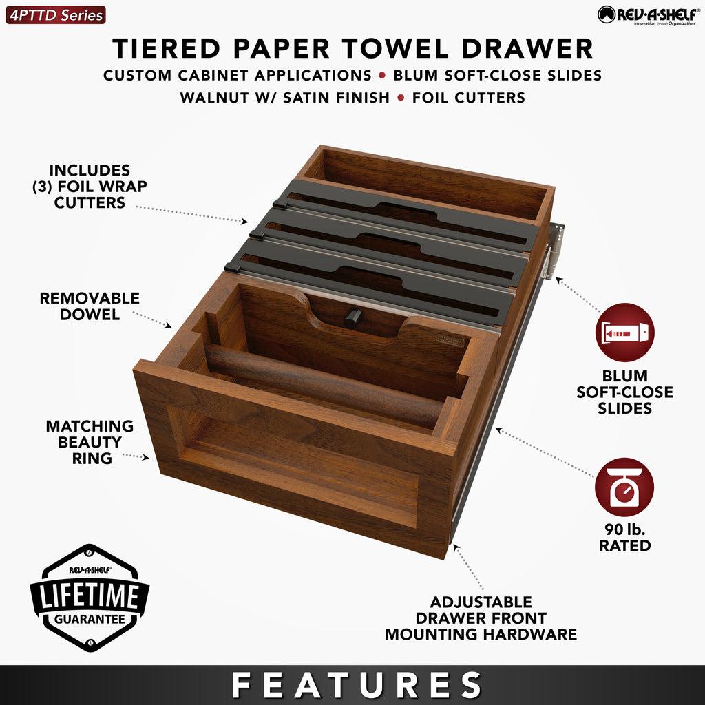 REV A SHELF : Walnut Paper Towel and Foil Wrap Tiered Drawer System w/ BLUM Soft-Close Slides for 18" Base Cabinets