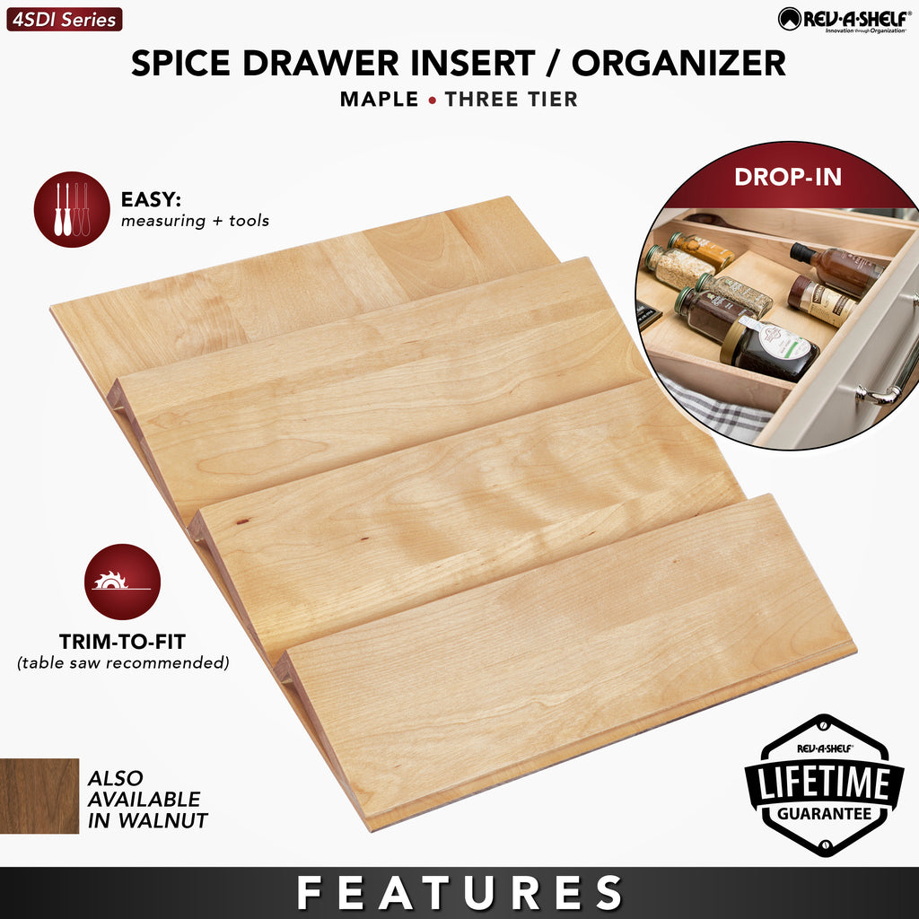 The popular Rev-A-Shelf 4SDI Spice Drawer Inserts are available in beautiful maple or walnut! Designed for 36" or smaller base cabinet drawers, this trim-to-fit insert features walnut or maple construction with a satin finish, one rear storage compartment and up to (3) tiers for all your spices. Combine with our 4WD Wood Dividers or use individually to fit your exact organizational needs.. Included: (1) Wood spice drawer insert