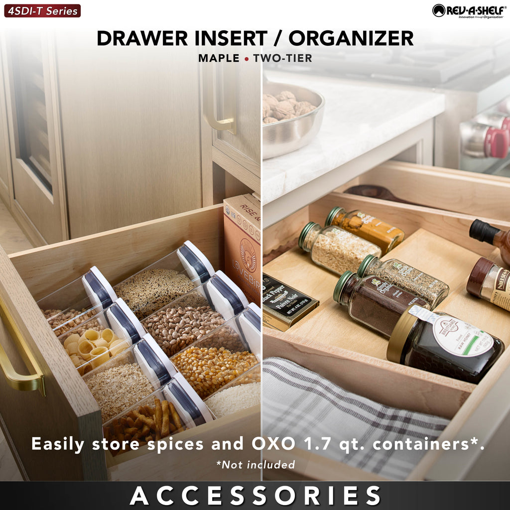 If you are having a hard time seeing everything you have stored in your deep kitchen drawers, we have the solution for you! Designed for 18” and 24” base cabinet deep drawers, these drop-in drawer inserts feature a snug fit, one rear storage compartment and up to two tiers. The natural maple construction with a semi-gloss finish blends seamlessly into your existing drawer, and the tiered design maximizes the accessible space.. Included: (1) Wood tall spice drawer insert
