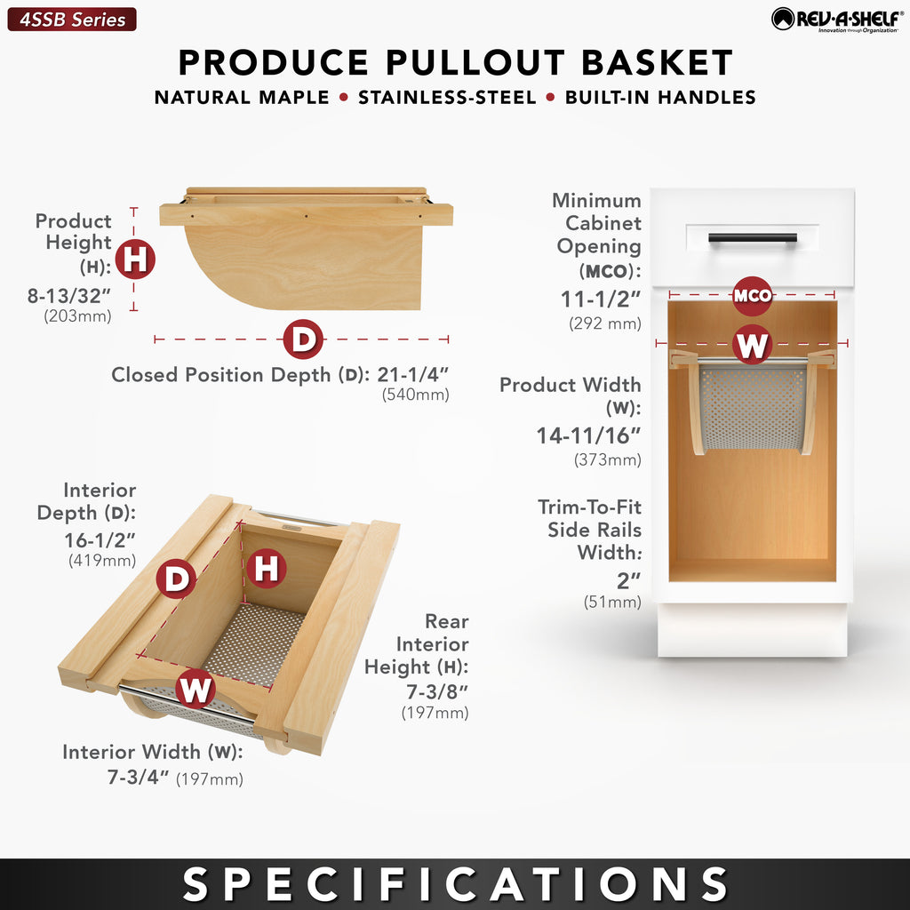 Store your produce in style with the 4SSB Series Stainless-Steel Produce Baskets! These removable baskets are designed for base cabinets and intended for use without cabinet doors. They are available in your choice of walnut or maple construction and feature either a stainless-steel bottom with matching handles or a luxurious black bottom with matching handles. The perforated design promotes ample air circulation and prevents moisture buildup, keeping your fruits and vegetables fresher for longer. Enjoy simple installation with trim-to-fit side rails and easy transportation using the built-in handles.. Included: (1) Wood produce basket, (2) trim-to-fit side rails (screws NOT included)