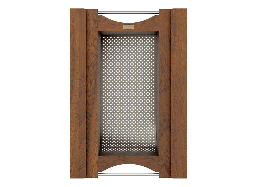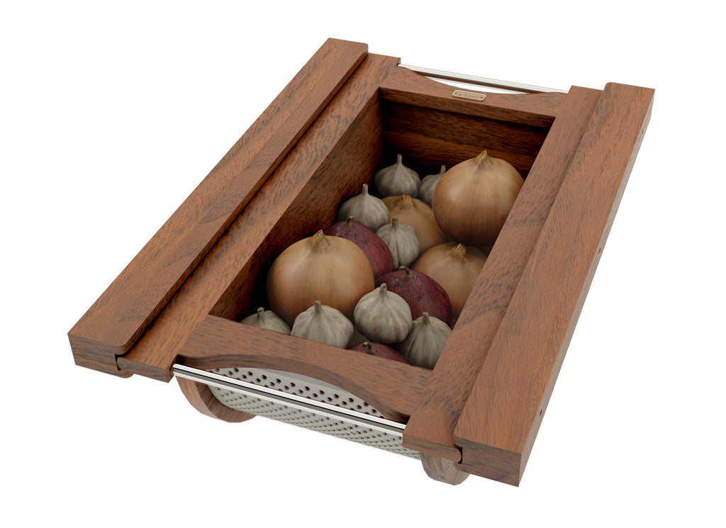 Store your produce in style with the 4SSB Series Stainless-Steel Produce Baskets! These removable baskets are designed for base cabinets and intended for use without cabinet doors. They are available in your choice of walnut or maple construction and feature either a stainless-steel bottom with matching handles or a luxurious black bottom with matching handles. The perforated design promotes ample air circulation and prevents moisture buildup, keeping your fruits and vegetables fresher for longer. Enjoy simple installation with trim-to-fit side rails and easy transportation using the built-in handles.. Included: (1) Wood produce basket, (2) trim-to-fit side rails (screws NOT included)