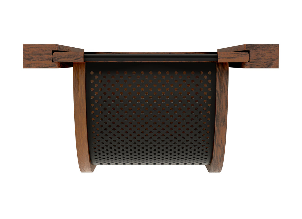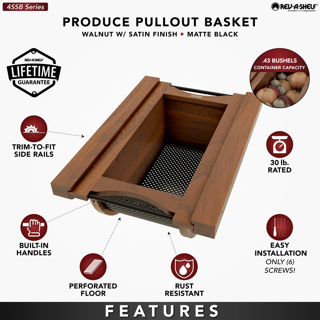 Store your produce in style with the 4SSB Series Stainless-Steel Produce Baskets! These removable baskets are designed for base cabinets and intended for use without cabinet doors. They are available in your choice of walnut or maple construction and feature either a stainless-steel bottom with matching handles or a luxurious black bottom with matching handles. The perforated design promotes ample air circulation and prevents moisture buildup, keeping your fruits and vegetables fresher for longer. Enjoy simple installation with trim-to-fit side rails and easy transportation using the built-in handles.. Included: (1) Wood produce basket, (2) trim-to-fit side rails (screws NOT included)