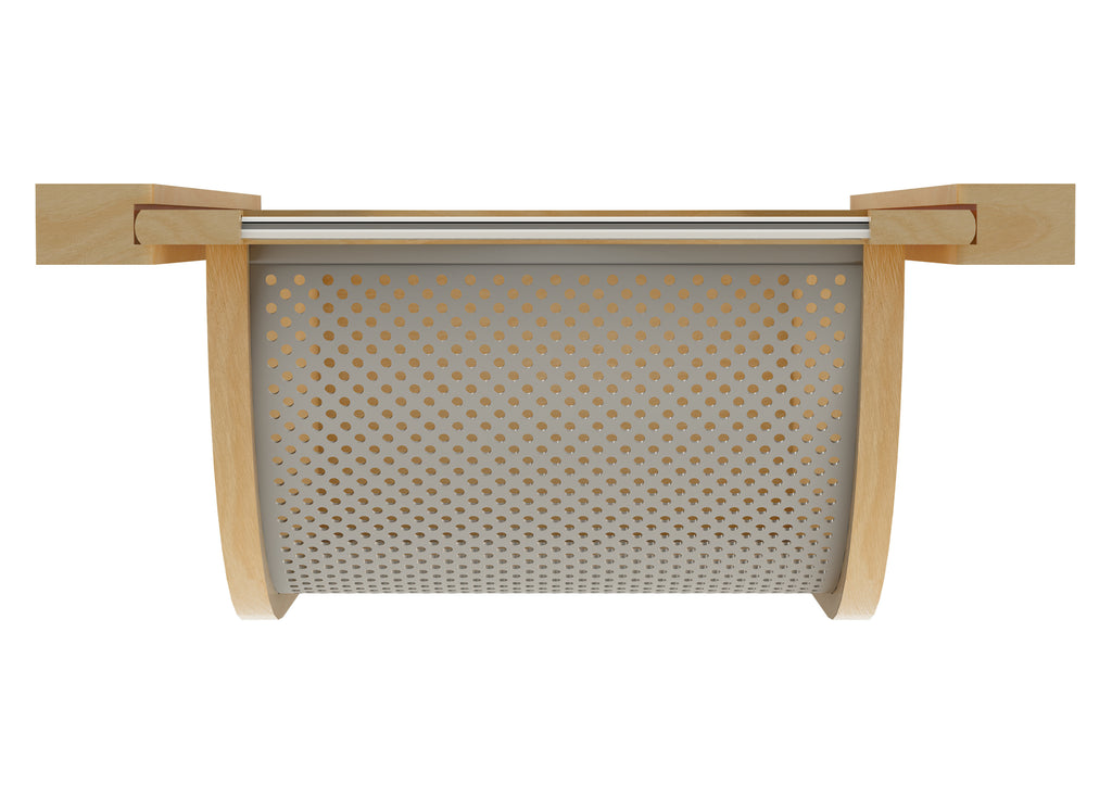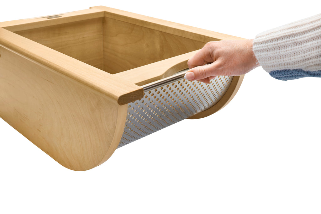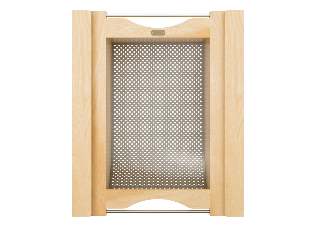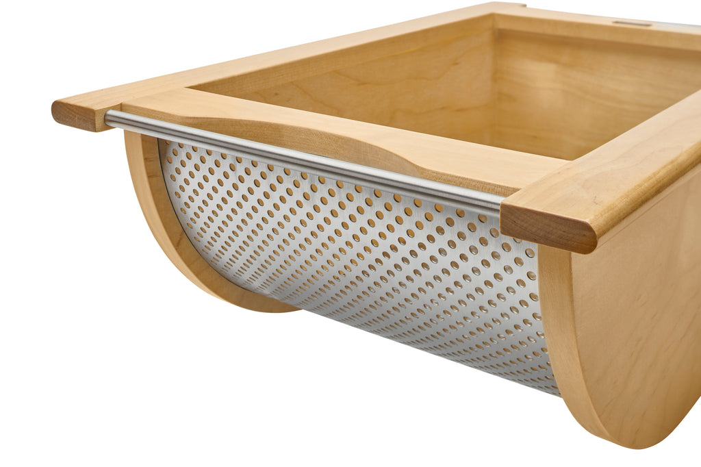Store your produce in style with the 4SSB Series Stainless-Steel Produce Baskets! These removable baskets are designed for base cabinets and intended for use without cabinet doors. They are available in your choice of walnut or maple construction and feature either a stainless-steel bottom with matching handles or a luxurious black bottom with matching handles. The perforated design promotes ample air circulation and prevents moisture buildup, keeping your fruits and vegetables fresher for longer. Enjoy simple installation with trim-to-fit side rails and easy transportation using the built-in handles.. Included: (1) Wood produce basket, (2) trim-to-fit side rails (screws NOT included)