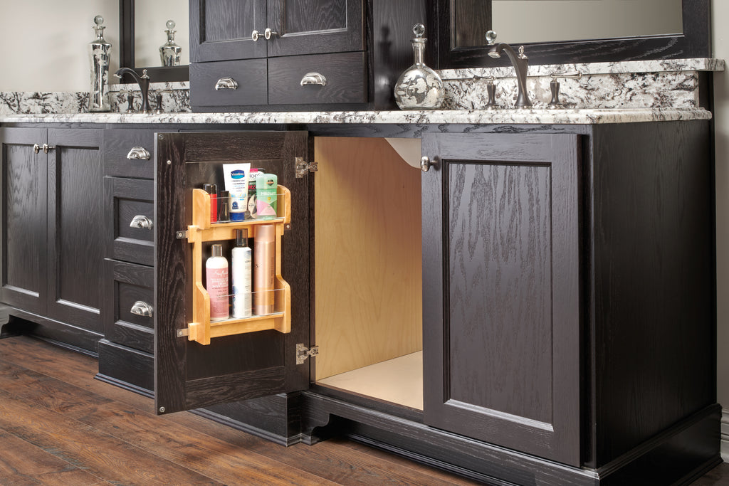 Conveniently store toiletries without compromising design with the Rev-A-Shelf® 4VR Series. Designed for 12", 15", 18", 21" and 24" vanity base cabinets. This unit features a maple frame with semi-gloss finish, two non-skid vinyl shelves with acrylic accents and our patented adjustable mounting brackets.. Included: (1) Wood Door Organizer and mounting hardware