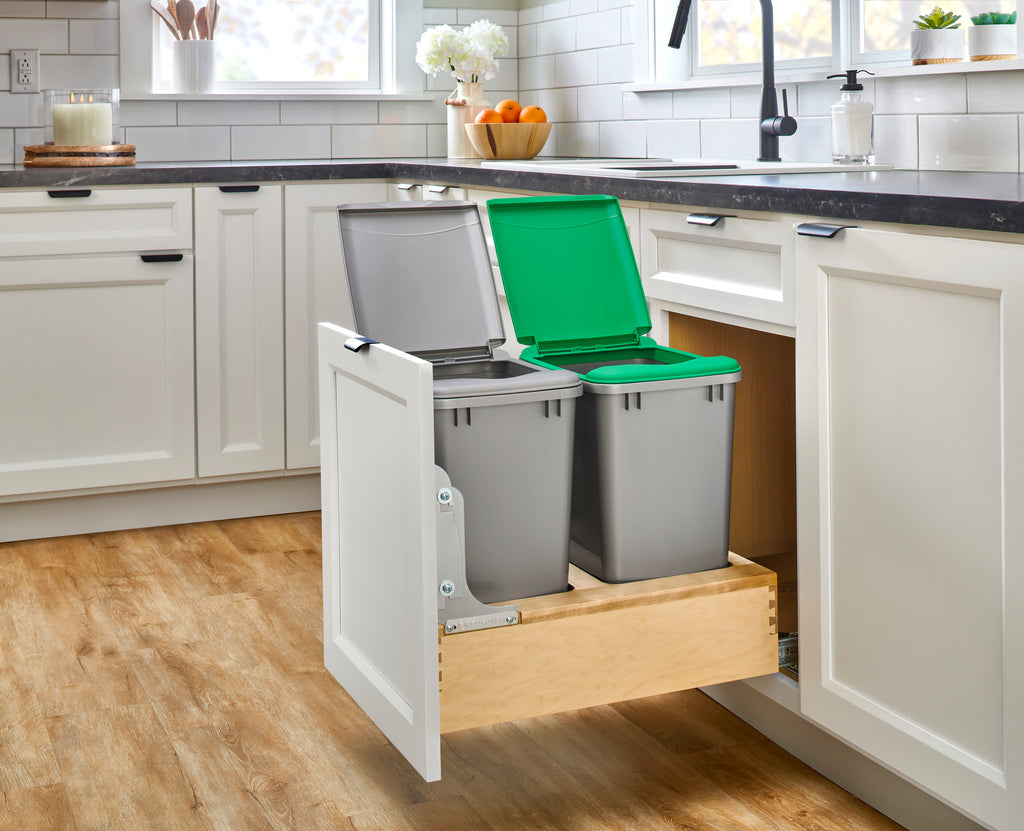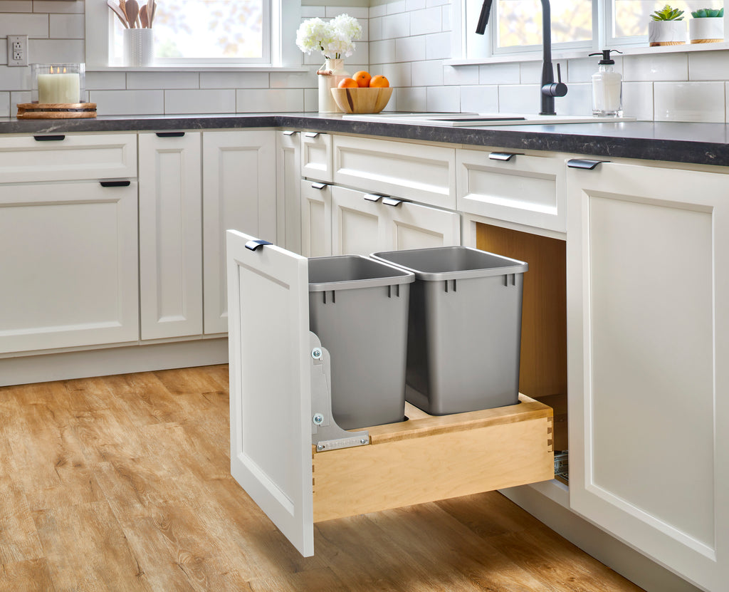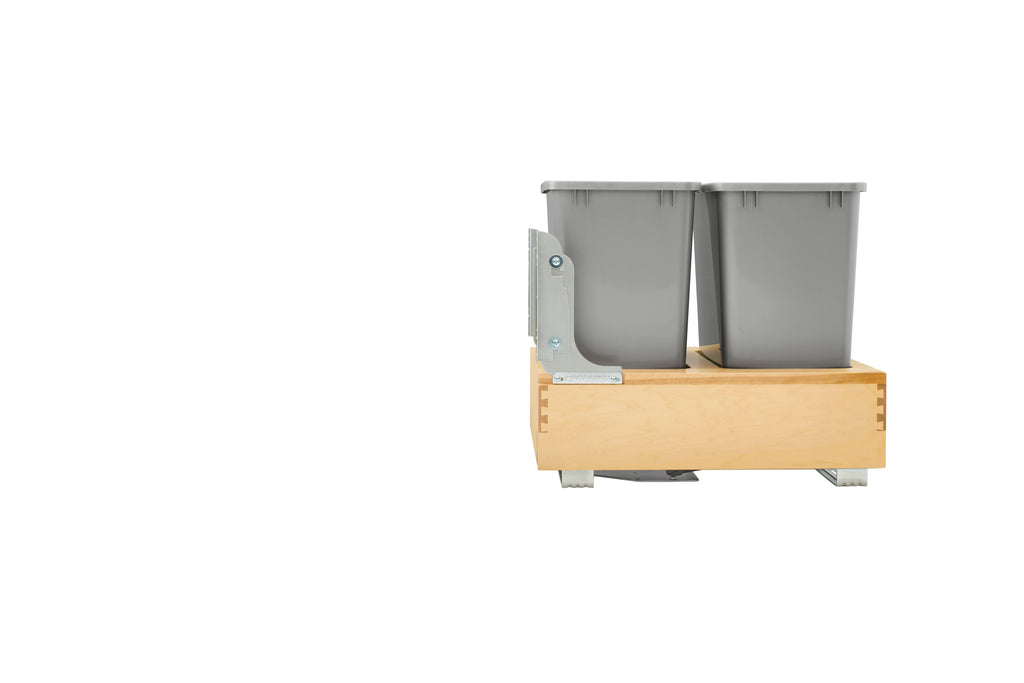 The 4WCBM Series Waste Containers are the only bottom mount units available with the Rev-A-Shelf® patented Rev-A-Motion® soft-open soft-close slide system. The innovative gas spring assisted soft-open allows the unit to open smoothly and the soft-close shuts softly, even under the heaviest of loads. All units feature metallic silver waste containers and built-in door-mount brackets and many have a removable wood bin in rear for bag storage. The 4WCBM is easy to install with only (5) screws and features a beautiful dovetail constructed frame, concealed 150 lb. slides for a clean look.. Included: (2) Silver 35 qt. waste containers, (1) wood frame, (1) pair of soft-close slides, mounting hardware, and Door-Mount brackets
