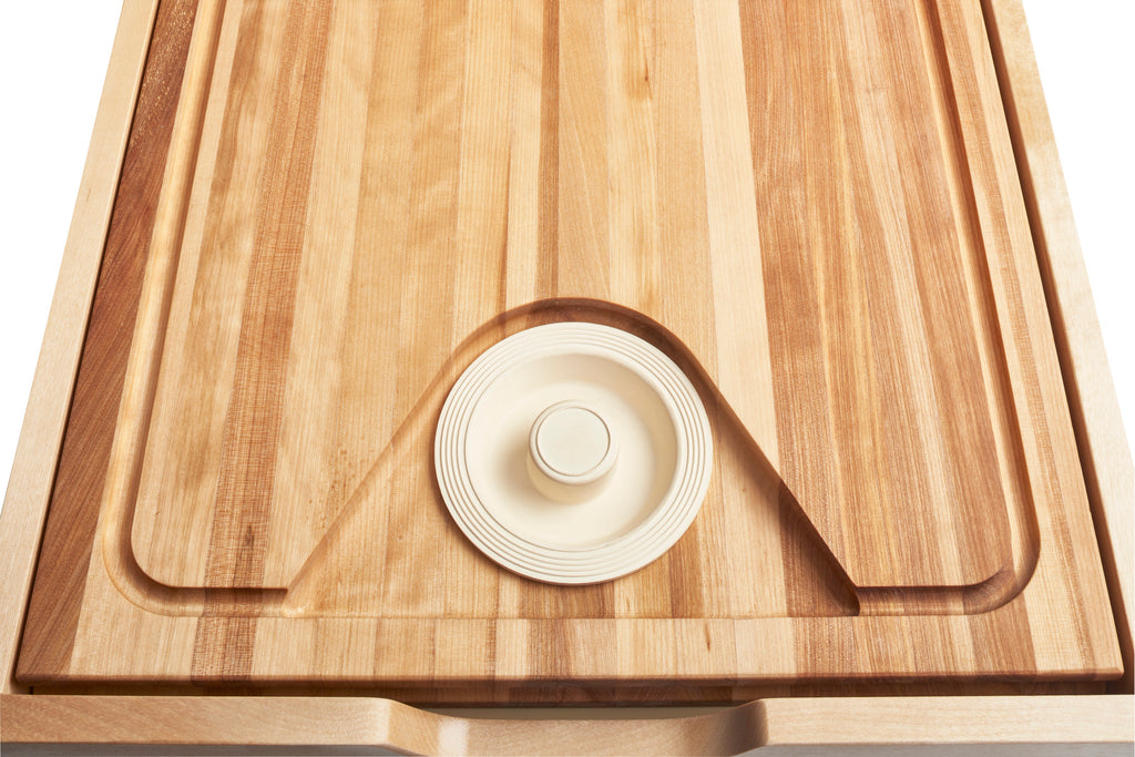 Save a step and reduce your food preparation time with the Rev-A-Shelf® 4WCCB series. This easy to install drawer system features natural maple construction, TANDEM slides with BLUM soft-close and drawer mounting brackets. The reversible wood cutting board has a unique cut-out and easy to clean funnel insert that allows you to conveniently discard scraps directly into waste container (waste container sold separately).. Included: (1) Cut-out cutting board drawer, (1) removable wood cut-out cutting board, (1) removable funnel insert and mounting hardware with slides