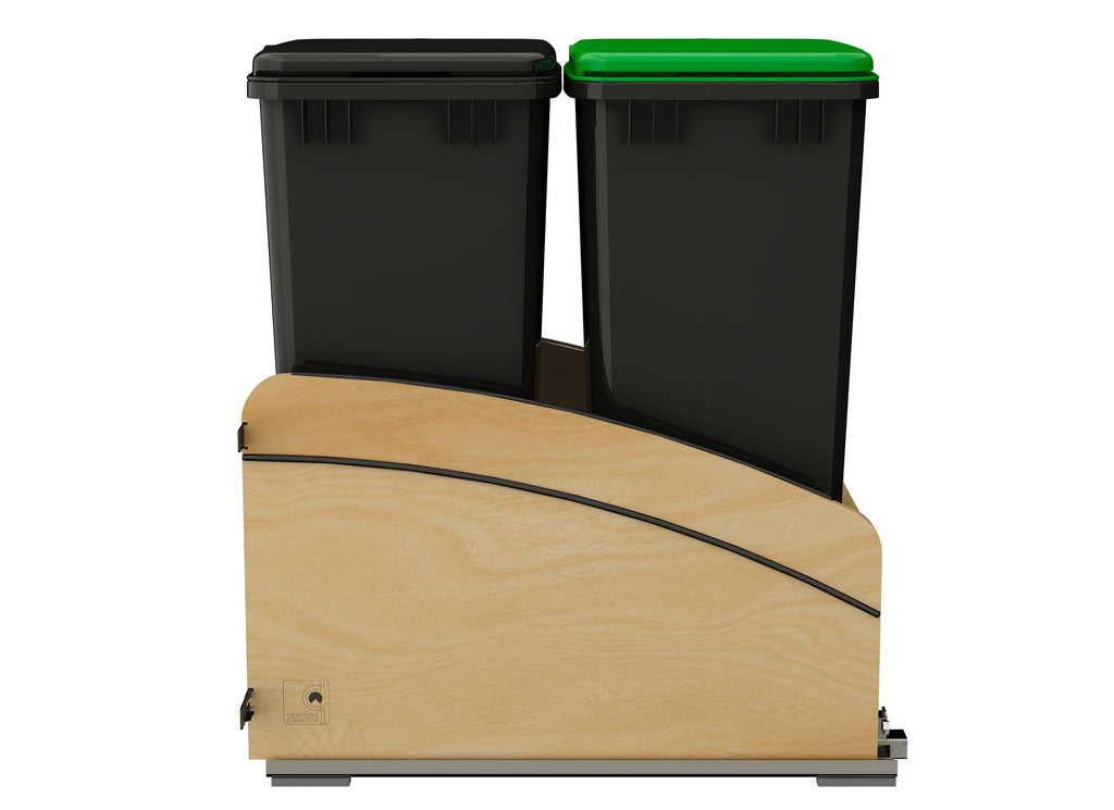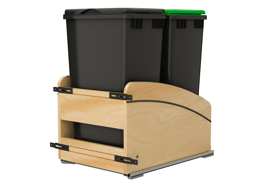 Stash your trash in luxurious style with the 4WCCC Series Craftsman Collection Bottom Mount Waste Container from Rev-A-Shelf®! This one-of-a-kind pullout waste container features the same solid wood construction, recessed wire matte black accents, and a stunning new design with furniture-grade soft edges that is cohesive throughout our entire Craftsman Collection. Enjoy soft-close slides and integrated door-mount brackets.. Included: (1) Wood frame, (1) pair of soft-close slides, (2) black 50 qt. waste containers, (2) lids and mounting hardware