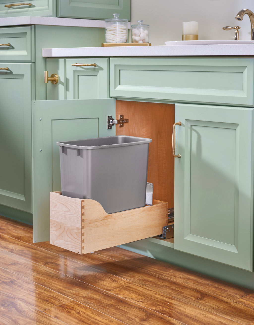Nothing beats the look and warmth of natural wood. Rev-A-Shelf® 4WCSC Series is one of the best-selling pullout trash containers and is specified by top kitchen designers. With its maple construction and BLUM drawer slides, it's no wonder why it is an industry favorite. Available in multiple widths, heights and polymer bin capacities, you will have no problem finding the right size to fit your cabinet or application.. Included: (1) Silver 20 qt. waste container, (1) wood frame, (1) pair of slides and mounting hardware