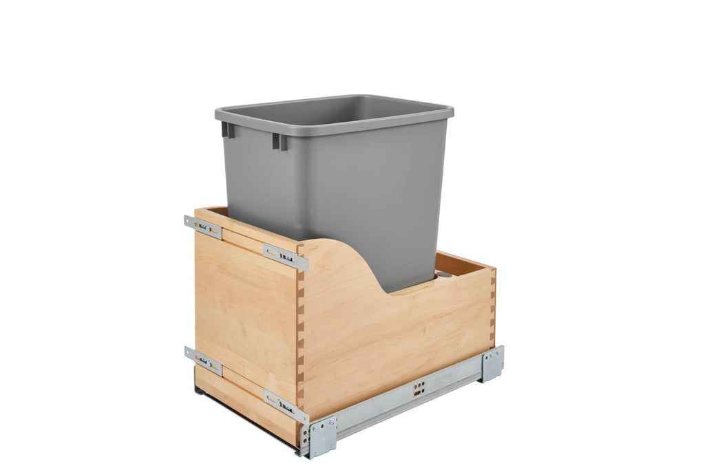 Nothing beats the look and warmth of natural wood. Rev-A-Shelf® 4WCSC Series is one of the best-selling pullout trash containers and is specified by top kitchen designers. With its maple construction and BLUM drawer slides, it's no wonder why it is an industry favorite. Available in multiple widths, heights and polymer bin capacities, you will have no problem finding the right size to fit your cabinet or application.. Included: (1) Silver 35 qt. waste container, (1) wood frame, (1) pair of slides, and mounting hardware