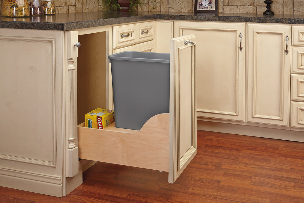 Nothing beats the look and warmth of natural wood. Rev-A-Shelf® 4WCSC Series is one of the best-selling pullout trash containers and is specified by top kitchen designers. With its maple construction and BLUM drawer slides, it's no wonder why it is an industry favorite. Available in multiple widths, heights and polymer bin capacities, you will have no problem finding the right size to fit your cabinet or application.. Included: (1) Silver 50 qt. waste container, (1) wood frame, (1) pair of slides, mounting hardware, and Door-Mount brackets