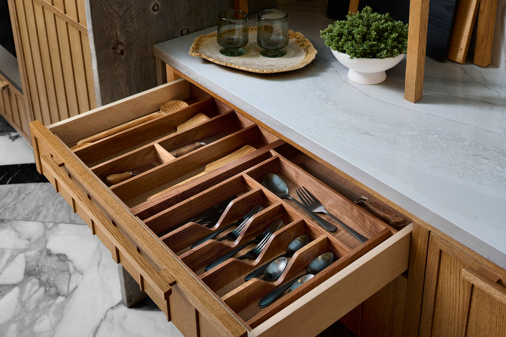 Organize kitchen drawers with the Rev-A-Shelf® Wood Cutlery Tray Insert. The 4WCT Series is made of our classic maple hardwood or beautiful walnut, with a UV-cured clear finish to ensure an acceptable match to any kitchen cabinet. This modern day clutter solution requires a simple drop-in installation with two sizes that may be trimmed-to-fit various drawer sizes.. Included: (1) Walnut cutlery drawer insert