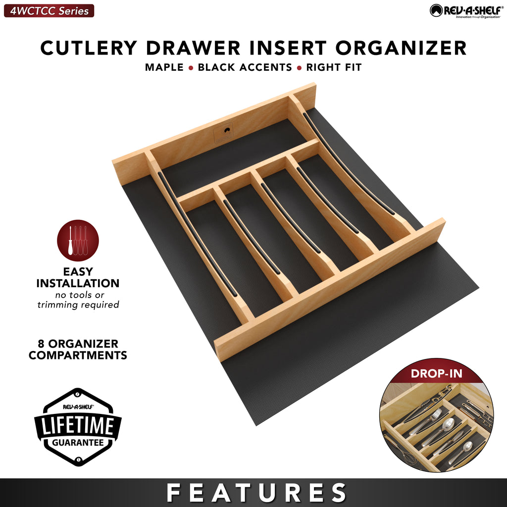 Luxury isn’t just about looks - it’s about smart design. Upgrade your kitchen drawers with the 4WCTCC Series Craftsman Collection Right-Fit Cutlery Tray Inserts! These beautiful drawer inserts feature solid maple construction with a semi-gloss finish and recessed black wire accents for a stylish look you can’t find anywhere else.