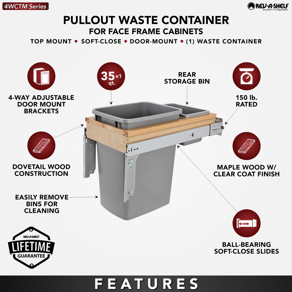 Only one pullout trash container series has stood the test of time and that is Rev-A-Shelf® Top Mount Series Waste Containers. The Top Mount series features beautiful fully assembled dovetail wood construction and full-extension soft-close slides for total access and easy removal of your trash bins. All of the top mount series also includes a 4-way adjustable door mount bracket that will finish off your installation by attaching your own cabinet door for easy operation.. Included: (1) Silver 35 qt. waste container, (1) rear polymer bin, (1) wood frame for 1-1/2" face frame cabinet, (1) pair of slides, mounting hardware, and Door-Mount brackets