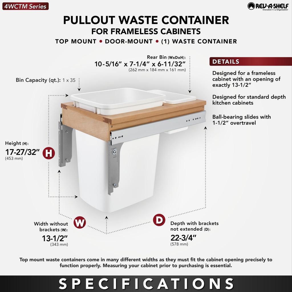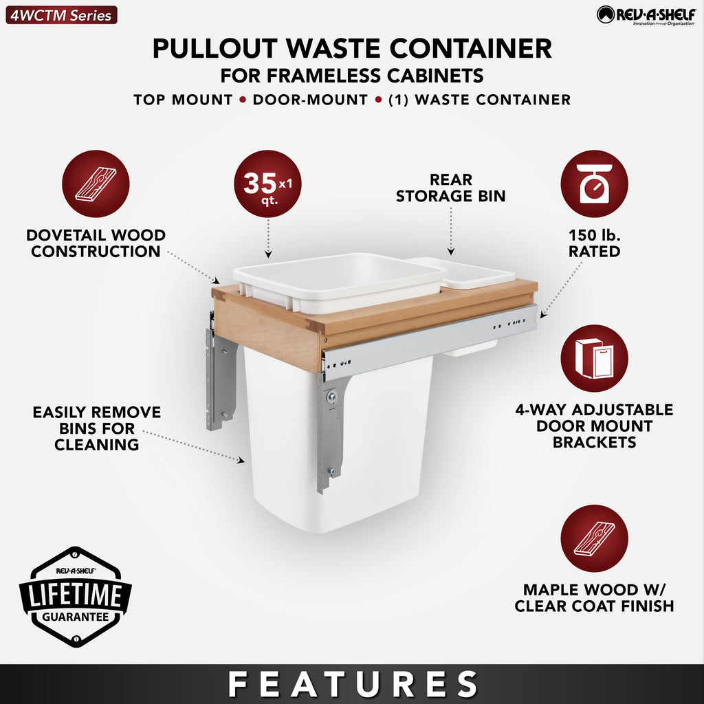 Only one pullout trash container series has stood the test of time and that is Rev-A-Shelf® Top Mount Series Waste Containers. The Top Mount series features beautiful fully assembled dovetail wood construction and full-extension slides for total access and easy removal of your trash bins. All of the top mount series also includes a 4-way adjustable door-mount bracket that will finish off your installation by attaching your own cabinet door for easy operation. Available in various widths, depths and heights for your specific cabinet application.. Included: (1) White 35 qt. waste container, (1) rear polymer bin, (1) wood frame for frameless cabinet, (1) pair of slides, mounting hardware, and Door-Mount brackets