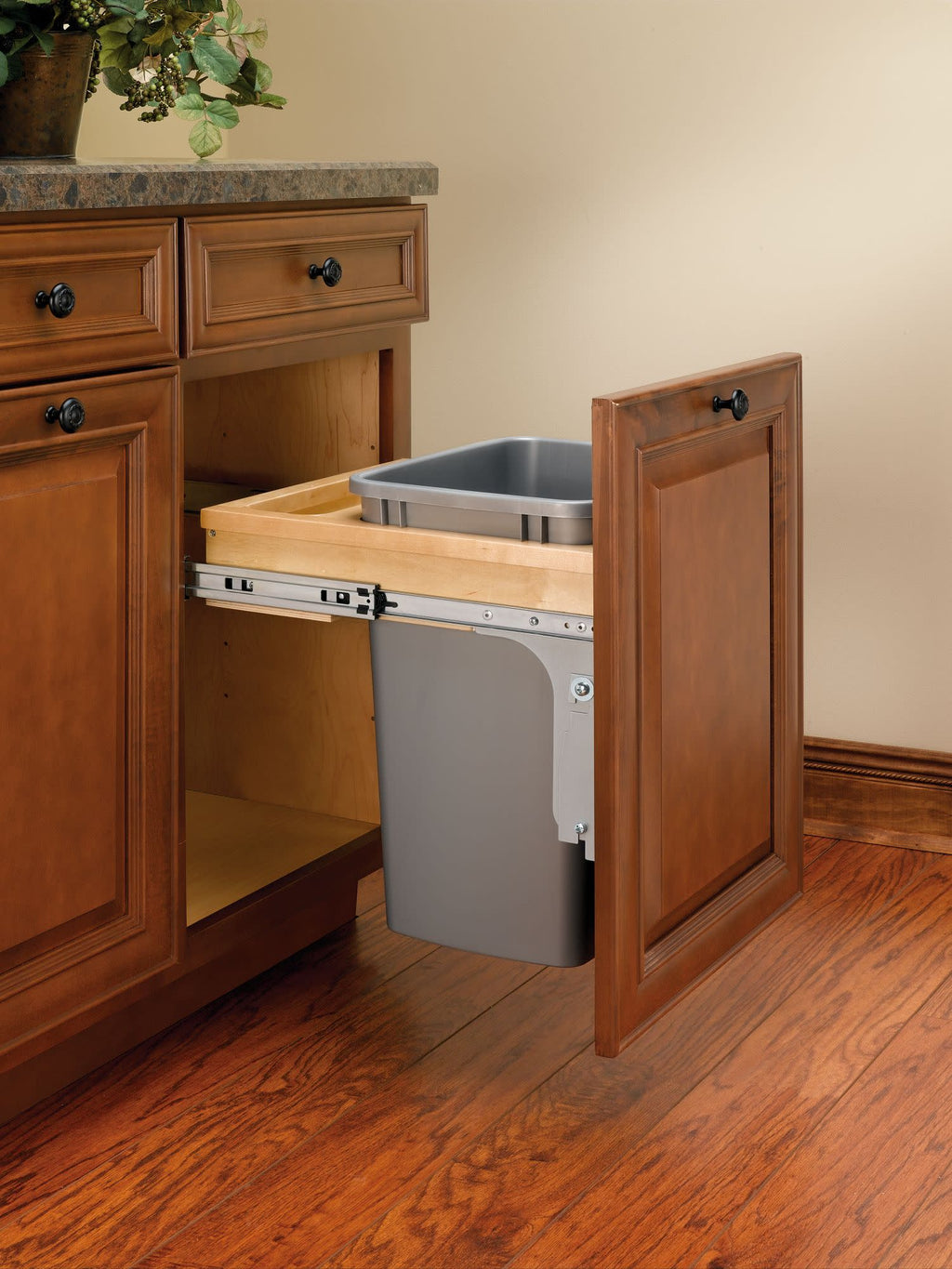 Only one pullout trash container series has stood the test of time and that is Rev-A-Shelf® Top Mount Series Waste Containers. The Top Mount series features beautiful fully assembled dovetail wood construction and full-extension slides for total access and easy removal of your trash bins. All of the top mount series also includes a 4-way adjustable door-mount bracket that will finish off your installation by attaching your own cabinet door for easy operation. Available in various widths, depths and heights for your specific cabinet application.. Included: (1) Silver 35 qt. waste container, (1) wood frame for 1-1/2" face frame cabinet, (1) pair of slides, mounting hardware, and Door-Mount brackets