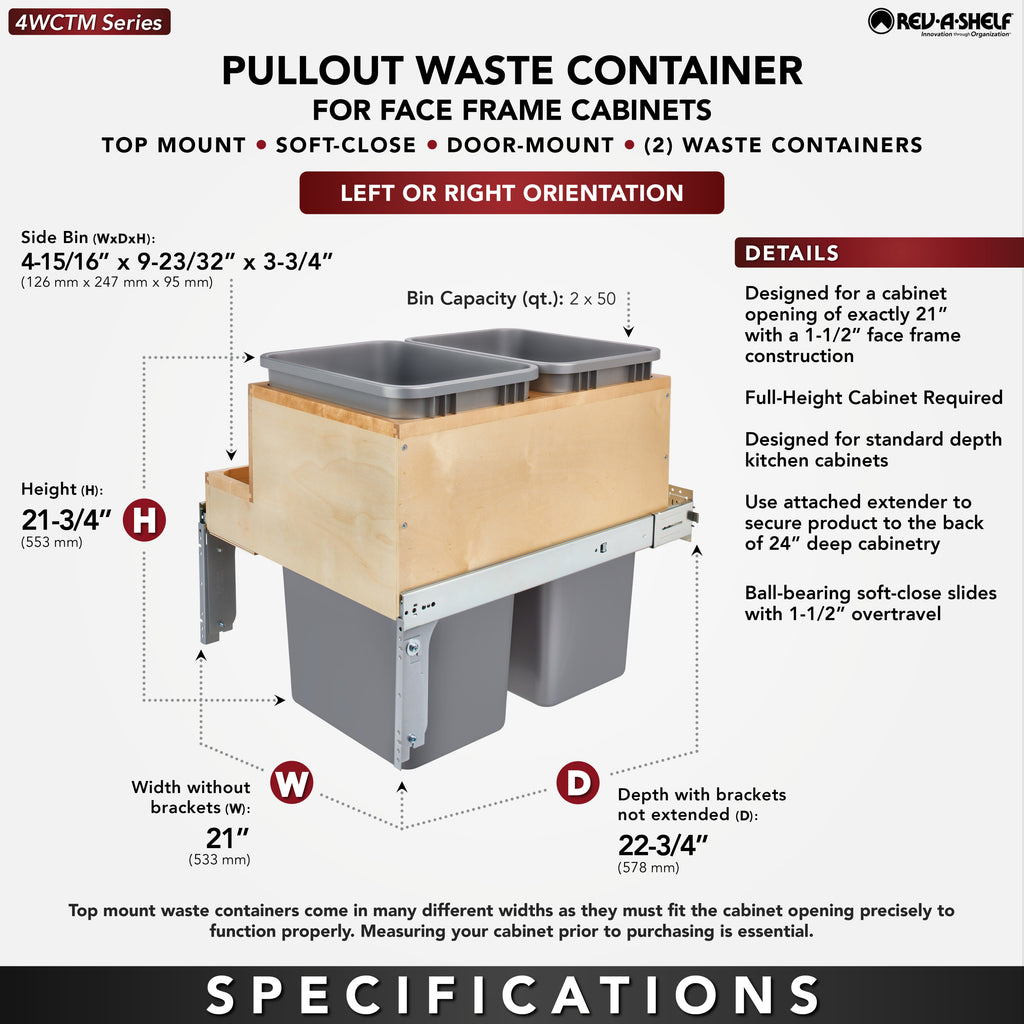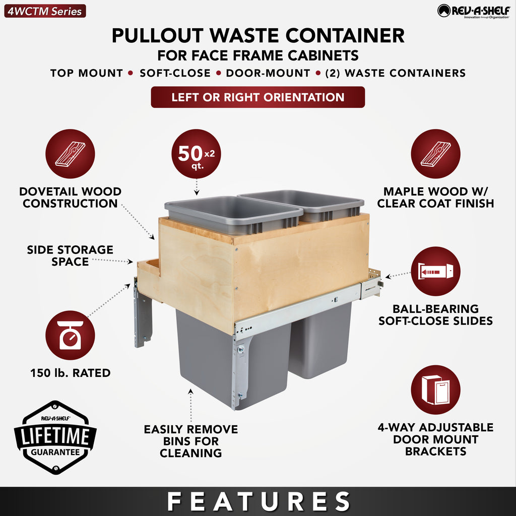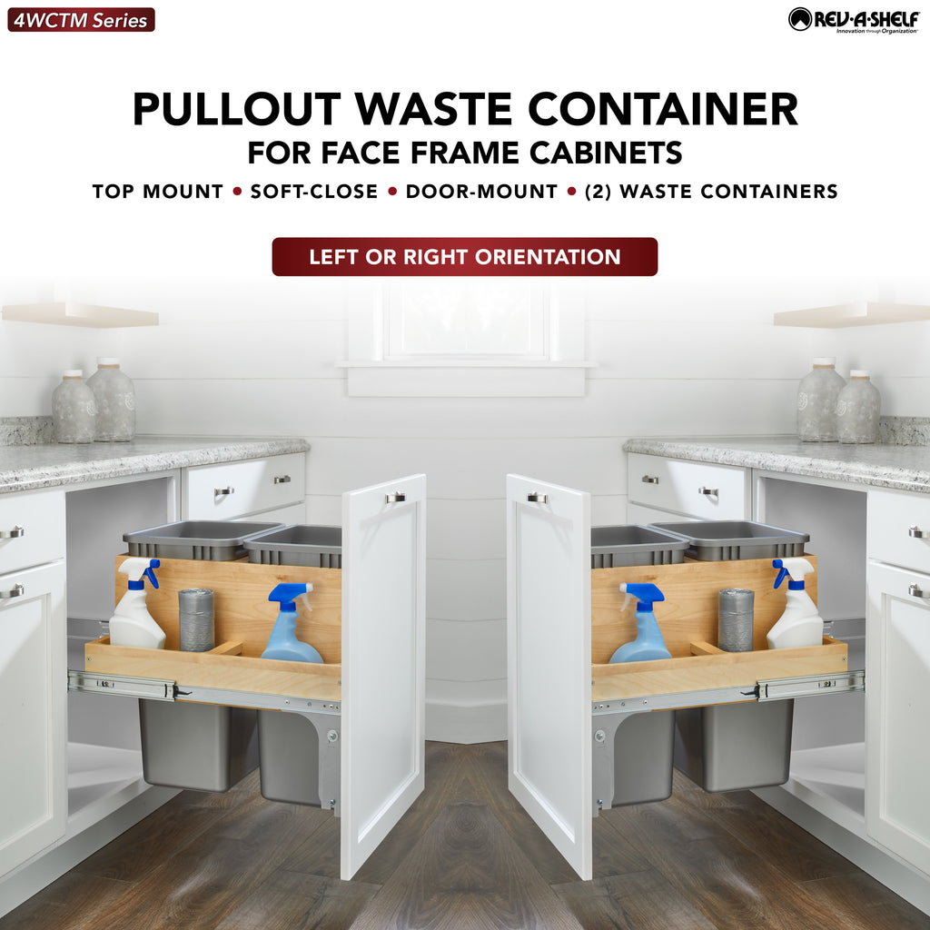 Only one pullout trash container series has stood the test of time and that is Rev-A-Shelf® Top Mount Series Waste Containers. The Top Mount series features beautiful fully assembled dovetail wood construction and full-extension soft-close slides for total access and easy removal of your trash bins. All of the top mount series also includes a 4-way adjustable door mount bracket that will finish off your installation by attaching your own cabinet door for easy operation.. Included: (2) Silver 50 qt. waste containers, (1) wood frame for 1-1/2" face frame cabinet, (1) pair of slides, mounting hardware, and Door-Mount brackets