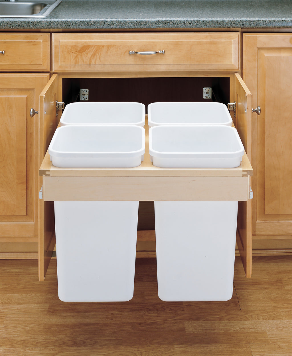 Rev-A-Shelf® Top Mount Wood Waste Containers are industry favorites. These waste containers are designed for absolute sturdiness with front and rear mounting, pre-installed door mount brackets (on most units) and full-extension 150 lb. rated ball-bearing slides for total stability.. Included: (4) White 27 qt. waste containers, (1) wood frame for for 1-1/2" face frame cabinet, (1) pair of slides, and mounting hardware