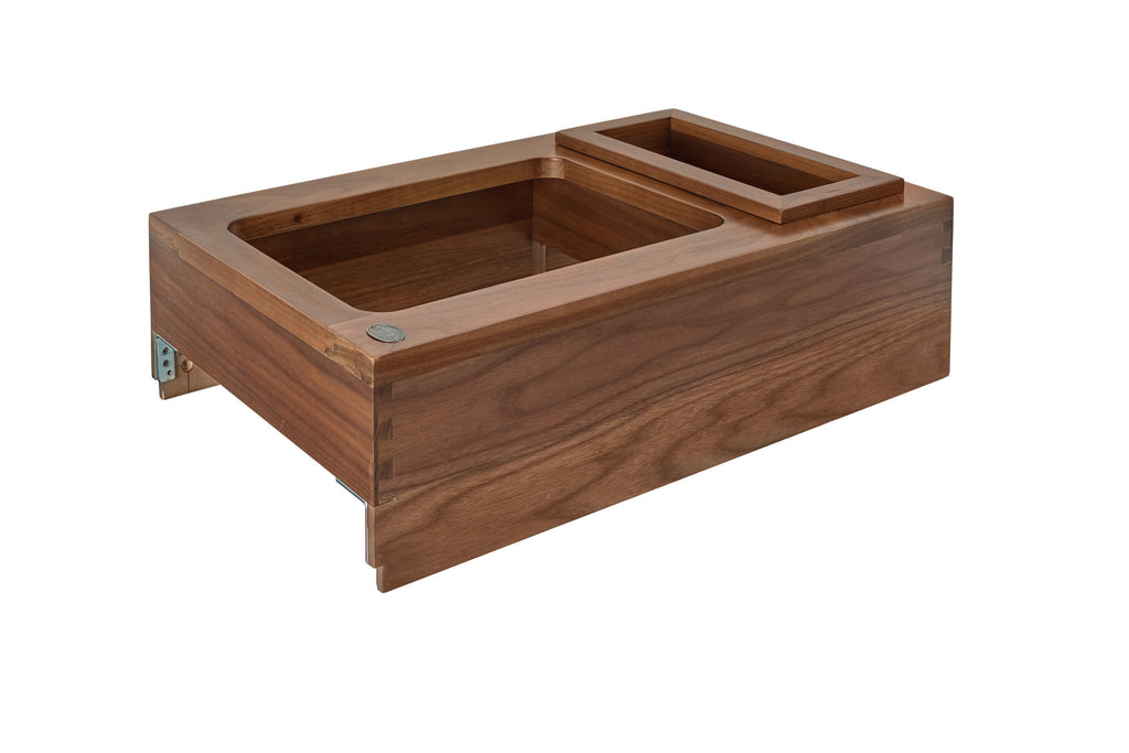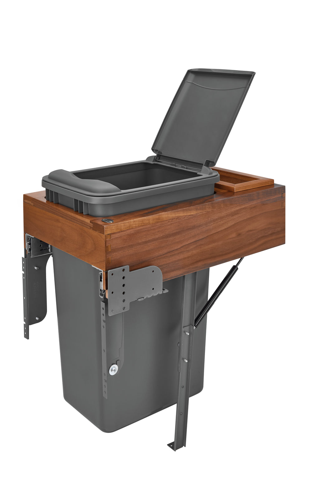 Only one pullout trash container series has stood the test of time and that is Rev-A-Shelf® Top Mount Series Waste Containers. The Patented Rev-A-Motion® Top Mount series will not only close softly, but it will also assist you when opening your unit with its patented slide and dampener system. All of the top mount series also includes a 4-way adjustable door mount bracket that will finish off your installation by attaching your own cabinet door for easy operation.. Included: (1) Silver 50 qt. waste container, (1) wood frame, (1) pair of slides, mounting hardware, and Door-Mount brackets