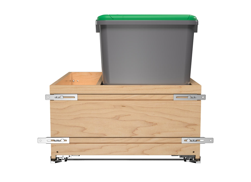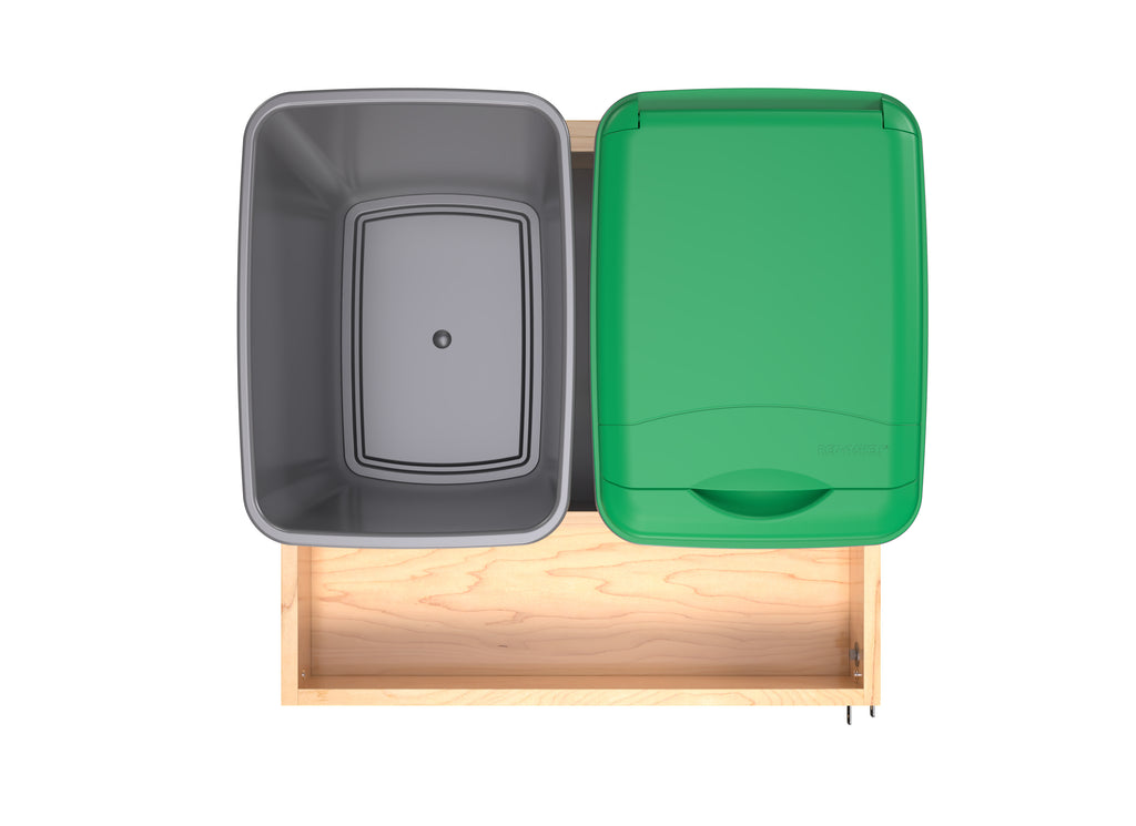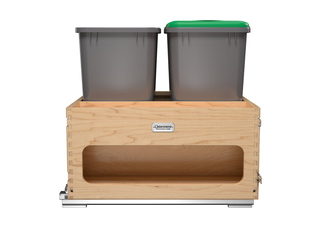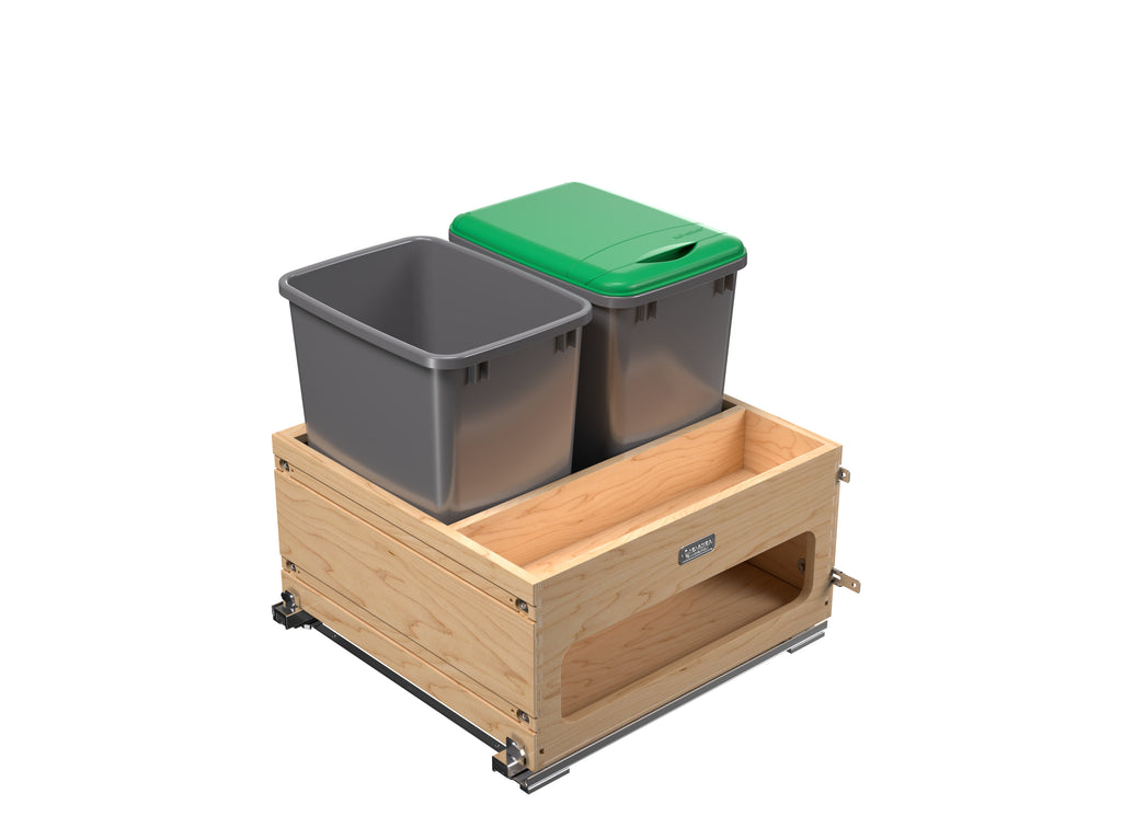 If you are looking for an all-in-one solution for your trash, recycling, and/or organic waste… your search is over! Rev-A-Shelf® is proud to introduce the 4WCWM Series Wood Bottom Mount Waste Management Center. Available with your choice of additional storage on the side or two 8 L containers (perfect for composting) held securely in place with a maple beauty ring, this pullout is a great addition to any kitchen. The maple dovetail frame glides on soft-close slides and boasts a reversible design with a side storage compartment.. Included: (1) Wood frame, (2) 35 qt. sliver waste containers, (1) 35 qt. green lid, BLUM soft-close slides and mounting hardware